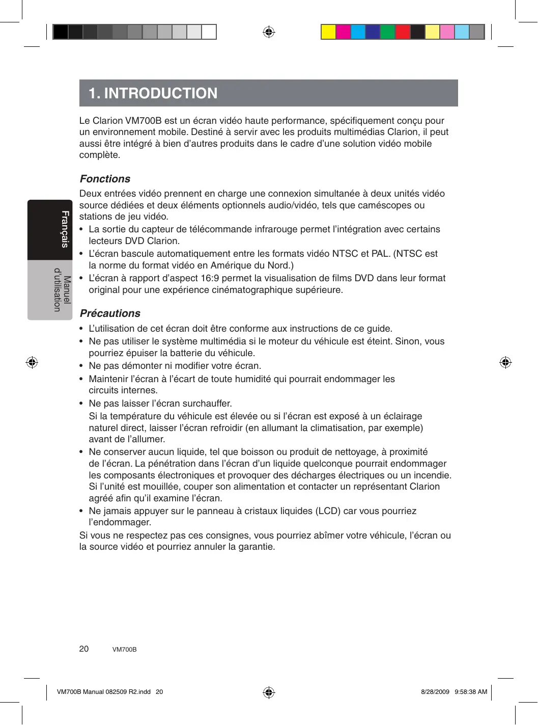 À AVERTISSEMENT L'écran Clarion VM700B est conçu pour une visualisation par un passager situé dans un fauteuil arrière de véhicule uniquement.