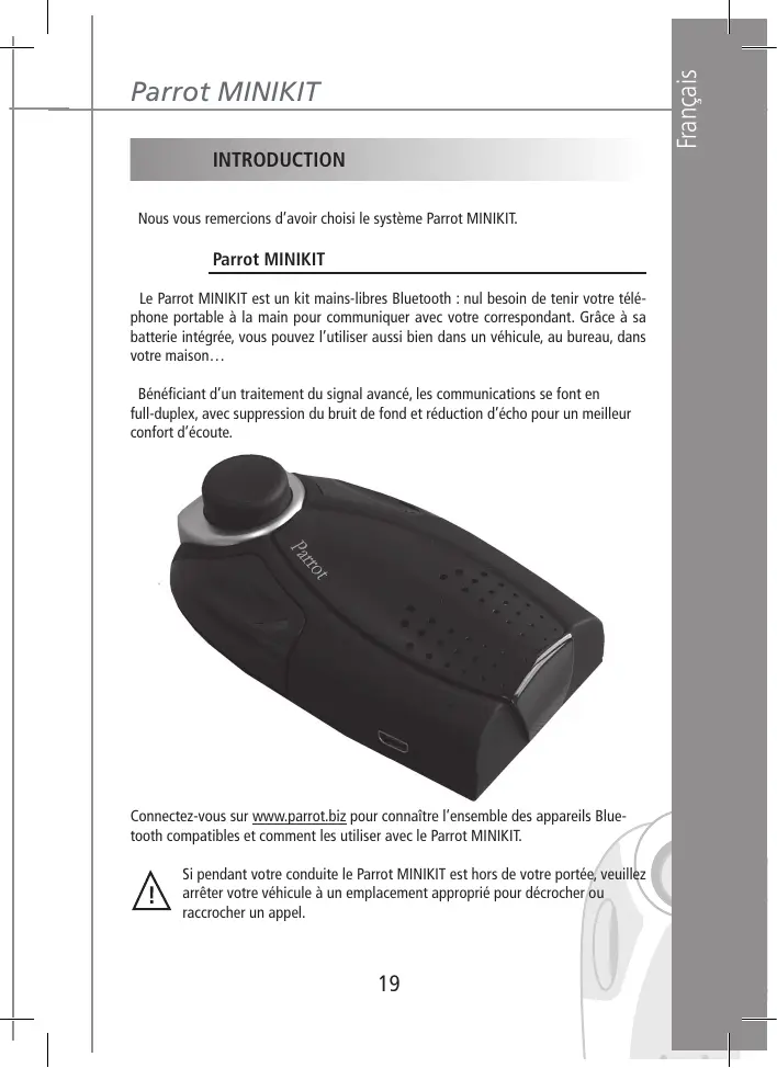 MINIKIT - Kit mains libres PARROT - Notice d'utilisation et mode d'emploi gratuit
