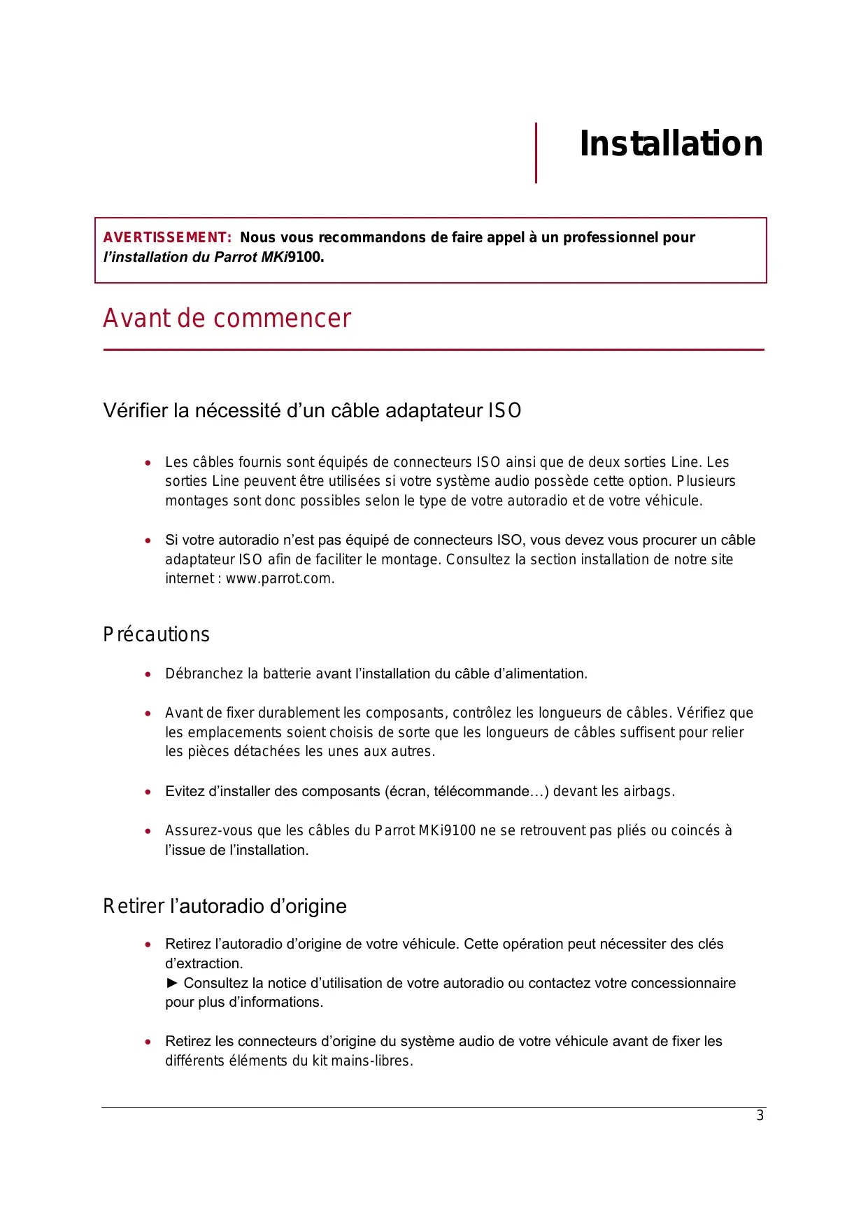 Sommaire Installation 3 Avant de commencer 3 Vérifier la nécessité d’un câble adaptateur ISO 3 Précautions 3 Retirer l’autoradio d’origine 3 Installer le kit 4 Autoradio avec connecteur ISO 4 Autoradio avec entrées Line 5 Installer le boitier électronique 5 Installer le câble d’alimentation du kit 6 Vérifier l’installation 6 Installer les connecteurs audio 6 Installer les accessoires 7 Installer le double microphone 7 Installer la télécommande 9 Installer l’écran 10