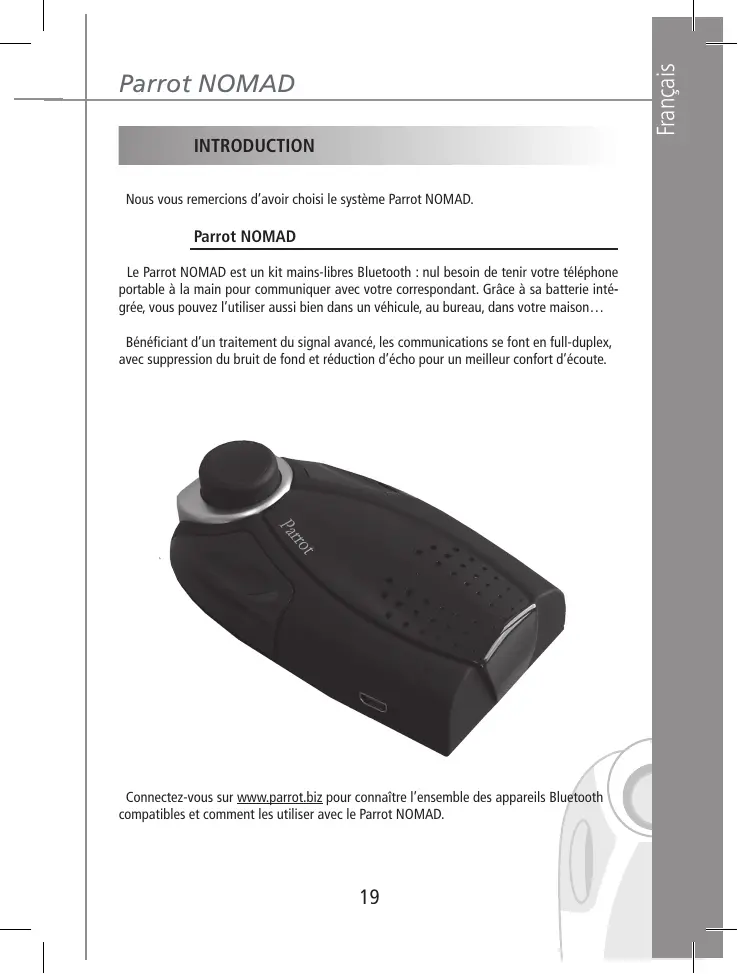 Parrot NOMAD SOMMAIRE p 19 INTRODUCTION p 20 CONTENU DE L’EMBALLAGE p 20