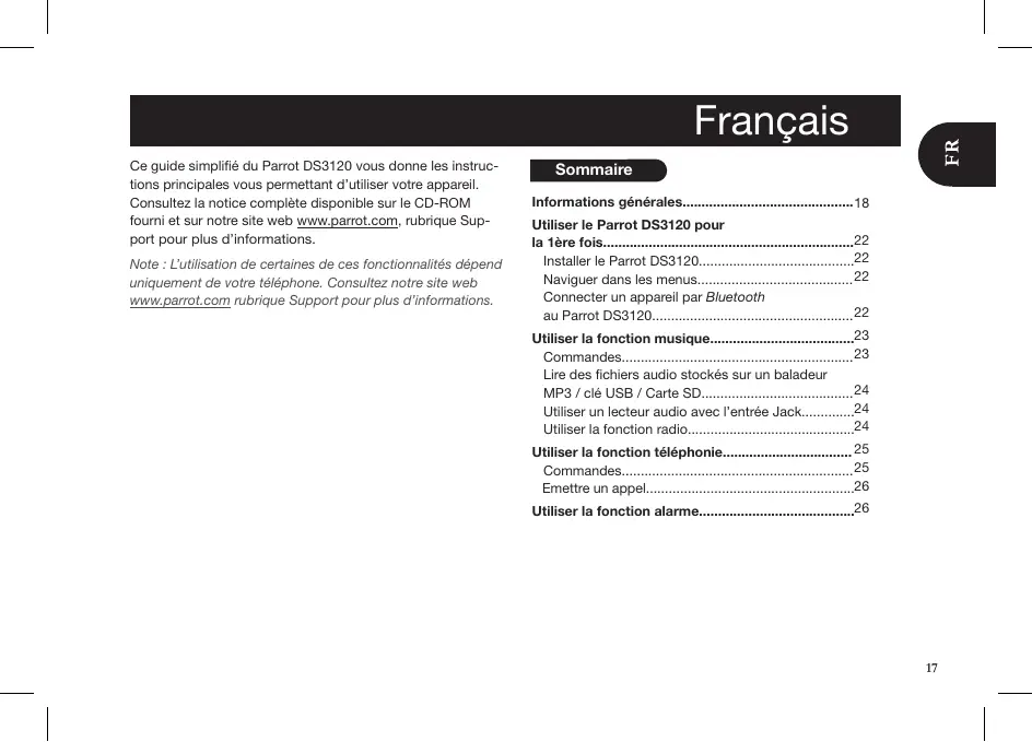 Gonnecter un apparel par Bluetooth au Parrot DS3120. 22 Utiliser a fonction musique. Commandes. Lire des fichiers audio stockés sur un baladeur MP3 / clé USB / Carte SD. 24 Utliser un lecteur audio avec l'entrée Jack. 24 Utiiser la fonction radio 24