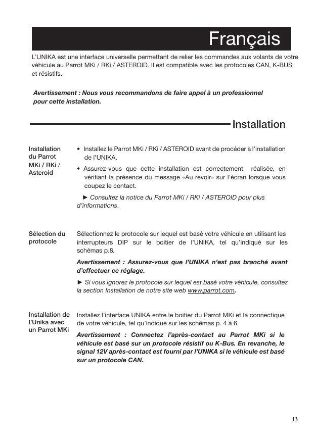 MKi/ RKI/ Asteroid Avertissement : Connectez l'après-contact au Parrot MKI si le véhicule est basé sur un protocole résistif ou K-Bus. En revanche, le signal 12V après-contact est fourni par l'UNIKA si le véhicule est basé sur un protocole CAN.