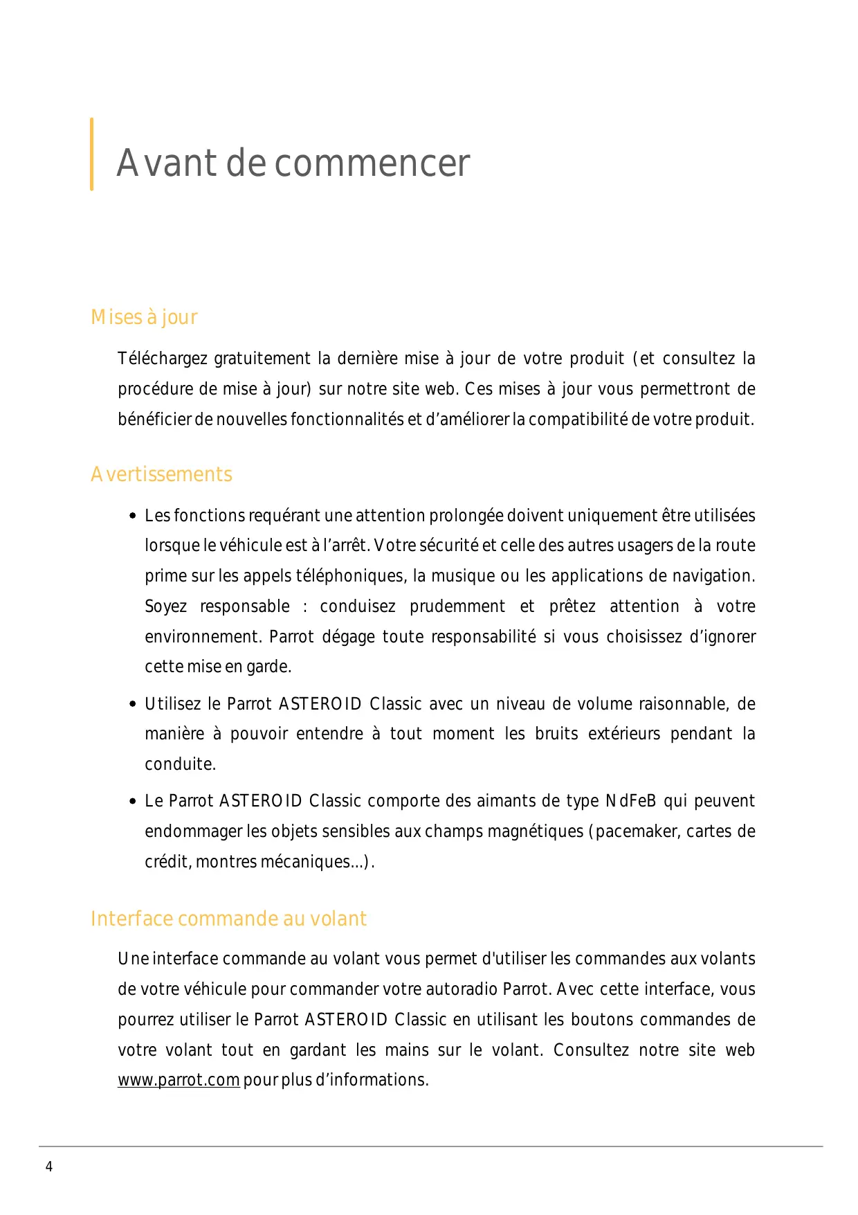 Avant de commencer Mises à jour Téléchargez gratuitement la dernière mise à jour de votre produit (et consultez la procédure de mise à jour) sur notre site web. Ces mises à jour vous permettront de bénéficier de nouvelles fonctionnalités et d’améliorer la compatibilité de votre produit. Avertissements Les fonctions requérant une attention prolongée doivent uniquement être utilisées lorsque le véhicule est à l’arrêt. Votre sécurité et celle des autres usagers de la route prime sur les appels téléphoniques, la musique ou les applications de navigation. Soyez responsable : conduisez prudemment et prêtez attention à votre environnement. Parrot dégage toute responsabilité si vous choisissez d’ignorer cette mise en garde. Utilisez le Parrot ASTEROID Classic avec un niveau de volume raisonnable, de manière à pouvoir entendre à tout moment les bruits extérieurs pendant la conduite. Le Parrot ASTEROID Classic comporte des aimants de type NdFeB qui peuvent endommager les objets sensibles aux champs magnétiques (pacemaker, cartes de crédit, montres mécaniques...). Interface commande au volant Une interface commande au volant vous permet d'utiliser les commandes aux volants de votre véhicule pour commander votre autoradio Parrot. Avec cette interface, vous pourrez utiliser le Parrot ASTEROID Classic en utilisant les boutons commandes de votre volant tout en gardant les mains sur le volant. Consultez notre site web www.parrot.com pour plus d’informations.