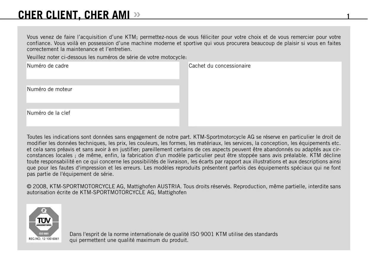 Vous venez de faire l’acquisition d’une KTM; permettez-nous de vous féliciter pour votre choix et de vous remercier pour votre confiance. Vous voilà en possession d’une machine moderne et sportive qui vous procurera beaucoup de plaisir si vous en faites correctement la maintenance et l’entretien. Veuillez noter ci-dessous les numéros de série de votre motocycle: Numéro de cadre Cachet du concessionaire Numéro de moteur Numéro de la clef Toutes les indications sont données sans engagement de notre part. KTM-Sportmotorcycle AG se réserve en particulier le droit de modifier les données techniques, les prix, les couleurs, les formes, les matériaux, les services, la conception, les équipements etc. et cela sans préavis et sans avoir à en justifier; pareillement certains de ces aspects peuvent être abandonnés ou adaptés aux circonstances locales ; de même, enfin, la fabrication d'un modèle particulier peut être stoppée sans avis préalable. KTM décline toute responsabilité en ce qui concerne les possibilités de livraison, les écarts par rapport aux illustrations et aux descriptions ainsi que pour les fautes d'impression et les erreurs. Les modèles reproduits présentent parfois des équipements spéciaux qui ne font pas partie de l'équipement de série. © 2008, KTM-SPORTMOTORCYCLE AG, Mattighofen AUSTRIA. Tous droits réservés. Reproduction, même partielle, interdite sans autorisation écrite de KTM-SPORTMOTORCYCLE AG, Mattighofen Dans l'esprit de la norme internationale de qualité ISO 9001 KTM utilise des standards qui permettent une qualité maximum du produit. REMARQUES IMPORTANTES »