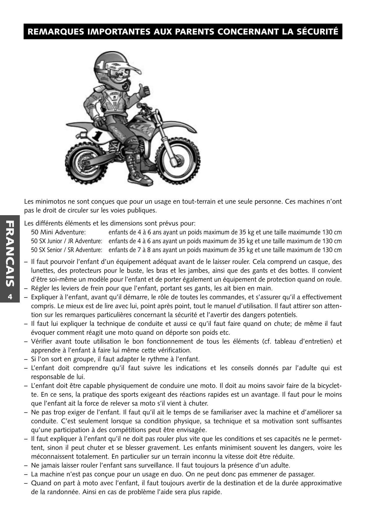Les différents éléments et les dimensions sont prévus pour: 50 Mini Adventure: enfants de 4 à 6 ans ayant un poids maximum de 35 kg et une taille maximumde 130 cm 50 SX Junior / JR Adventure: enfants de 4 à 6 ans ayant un poids maximum de 35 kg et une taille maximum de 130 cm 50 SX Senior / SR Adventure: enfants de 7 à 8 ans ayant un poids maximum de 35 kg et une taille maximum de 130 cm – Il faut pourvoir l’enfant d’un équipement adéquat avant de le laisser rouler. Cela comprend un casque, des lunettes, des protecteurs pour le buste, les bras et les jambes, ainsi que des gants et des bottes. Il convient d’être soi-même un modèle pour l’enfant et de porter également un équipement de protection quand on roule. – Régler les leviers de frein pour que l’enfant, portant ses gants, les ait bien en main. – Expliquer à l’enfant, avant qu’il démarre, le rôle de toutes les commandes, et s’assurer qu’il a effectivement compris. Le mieux est de lire avec lui, point après point, tout le manuel d’utilisation. Il faut attirer son attention sur les remarques particulières concernant la sécurité et l’avertir des dangers potentiels. – Il faut lui expliquer la technique de conduite et aussi ce qu’il faut faire quand on chute; de même il faut évoquer comment réagit une moto quand on déporte son poids etc. – Vérifier avant toute utilisation le bon fonctionnement de tous les éléments (cf. tableau d’entretien) et apprendre à l’enfant à faire lui même cette vérification. – Si l’on sort en groupe, il faut adapter le rythme à l’enfant. – L’enfant doit comprendre qu’il faut suivre les indications et les conseils donnés par l’adulte qui est responsable de lui. – L’enfant doit être capable physiquement de conduire une moto. Il doit au moins savoir faire de la bicyclette. En ce sens, la pratique des sports exigeant des réactions rapides est un avantage. Il faut pour le moins que l’enfant ait la force de relever sa moto s’il vient à chuter. – Ne pas trop exiger de l’enfant. Il faut qu’il ait le temps de se familiariser avec la machine et d’améliorer sa conduite. C’est seulement lorsque sa condition physique, sa technique et sa motivation sont suffisantes qu’une participation à des compétitions peut être envisagée. – Il faut expliquer à l’enfant qu’il ne doit pas rouler plus vite que les conditions et ses capacités ne le permettent, sinon il peut chuter et se blesser gravement. Les enfants minimisent souvent les dangers, voire les méconnaissent totalement. En particulier sur un terrain inconnu la vitesse doit être réduite. – Ne jamais laisser rouler l’enfant sans surveillance. Il faut toujours la présence d’un adulte. – La machine n’est pas conçue pour un usage en duo. On ne peut donc pas emmener de passager. – Quand on part à moto avec l’enfant, il faut toujours avertir de la destination et de la durée approximative de la randonnée. Ainsi en cas de problème l’aide sera plus rapide.