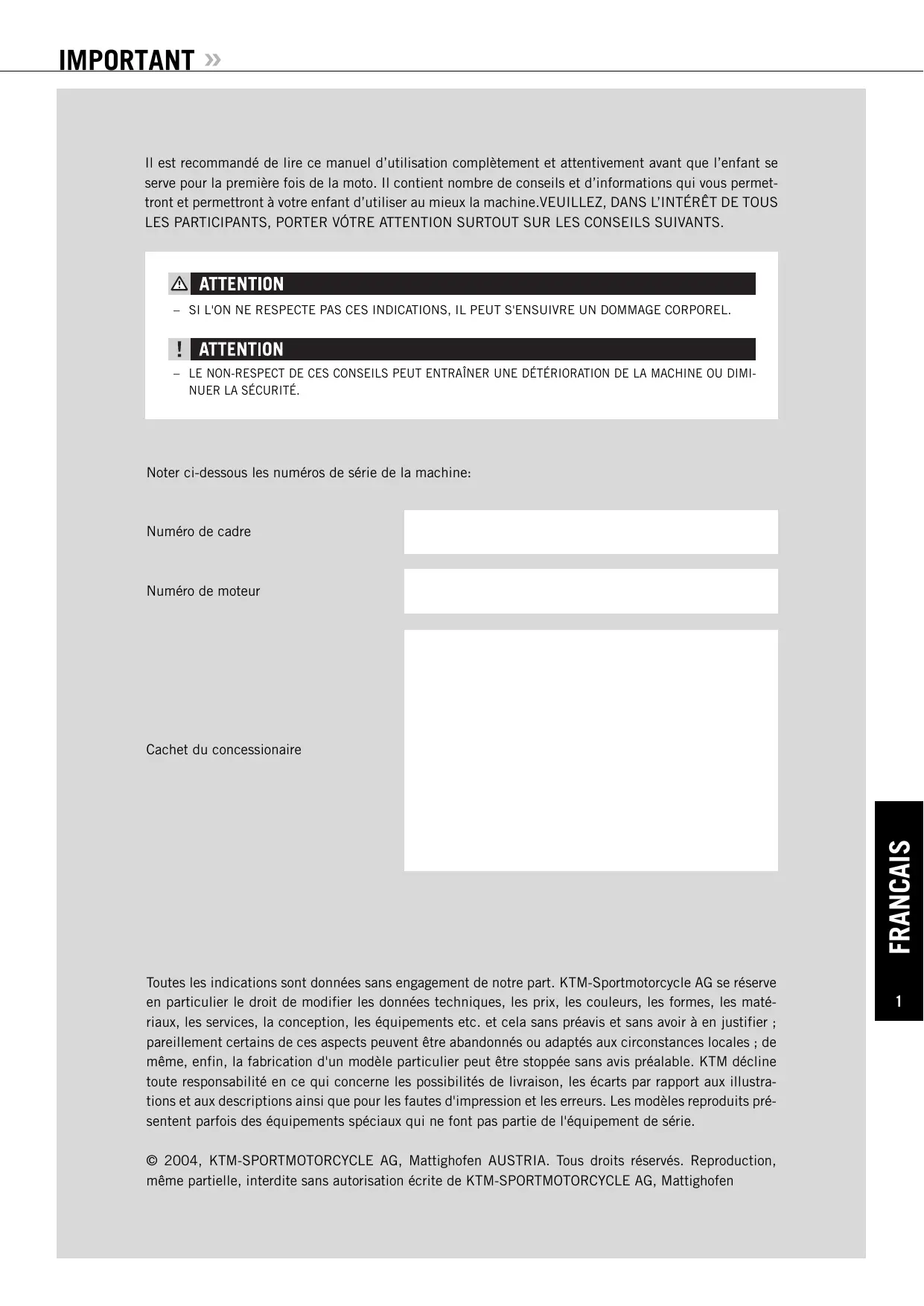 CHER CLIENT, CHER AMI Vous voilà en possession d'une machine moderne qui procurera à votre enfant et à vous-même beaucoup de plaisir si vous lui accordez le soin et l'attention nécessaires. Cette brochure contient les informations importantes concernant l'utilisation et l'entretien de votre nouvelle KTM. Elle a été réalisée en tenant compte des derniers développements techniques. Il se peut toutefois que depuis son impression de peti- tes améliorations aient encore été apportées aux machines. Le manuel d'utilisation est une composante de la machine et doit être remis au nouveau propriétaire en cas de revente de la moto.