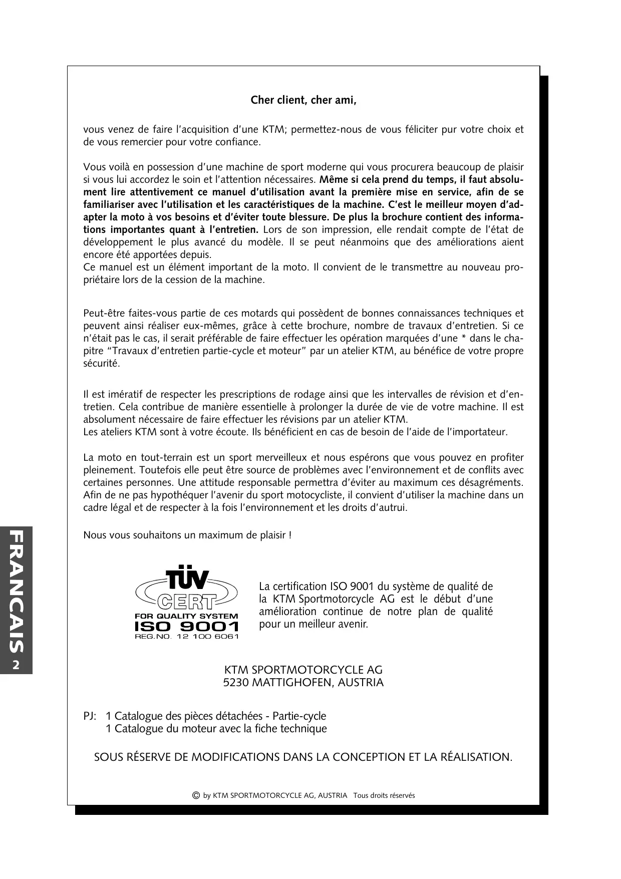 Cachet du concessionaire LA SOCIÉTÉ KTM SPORTMOTORCYCLE AG SE RÉSERVE LE DROIT DE MODIFIER SANS PRÉAVIS ET SANS AVOIR À SE JUSTIFIER LES ÉQUIPEMENTS, LES DONNÉES TECHNIQUES, LES COULEURS, LES MATÉRIAUX, LES SERVICES ET TOUT AUTRE CHOSE SEMBLABLE. ELLE PEUT MÊME OPÉRER DES SUPPRESSIONS SANS REMPLACEMENT. ELLE PEUT ÉGALEMENT ARRÊTER LA FABRICATION DE CERTAINS MODÈLES SANS ANNONCE PRÉALABLE. ELLE NE PEUT ÊTRE RESPONSABLE DES COQUILLES D'IMPRESSION. Cher client, cher ami, vous venez de faire l’acquisition d’une KTM; permettez-nous de vous féliciter pur votre choix et de vous remercier pour votre confiance. Vous voilà en possession d’une machine de sport moderne qui vous procurera beaucoup de plaisir si vous lui accordez le soin et l’attention nécessaires. Même si cela prend du temps, il faut absolument lire attentivement ce manuel d’utilisation avant la première mise en service, afin de se familiariser avec l’utilisation et les caractéristiques de la machine. C’est le meilleur moyen d’adapter la moto à vos besoins et d’éviter toute blessure. De plus la brochure contient des informations importantes quant à l’entretien. Lors de son impression, elle rendait compte de l’état de développement le plus avancé du modèle. Il se peut néanmoins que des améliorations aient encore été apportées depuis. Ce manuel est un élément important de la moto. Il convient de le transmettre au nouveau propriétaire lors de la cession de la machine. Peut-être faites-vous partie de ces motards qui possèdent de bonnes connaissances techniques et peuvent ainsi réaliser eux-mêmes, grâce à cette brochure, nombre de travaux d’entretien. Si ce n’était pas le cas, il serait préférable de faire effectuer les opération marquées d’une * dans le chapitre “Travaux d’entretien partie-cycle et moteur” par un atelier KTM, au bénéfice de votre propre sécurité. Il est imératif de respecter les prescriptions de rodage ainsi que les intervalles de révision et d’entretien. Cela contribue de manière essentielle à prolonger la durée de vie de votre machine. Il est absolument nécessaire de faire effectuer les révisions par un atelier KTM. Les ateliers KTM sont à votre écoute. Ils bénéficient en cas de besoin de l’aide de l’importateur. La moto en tout-terrain est un sport merveilleux et nous espérons que vous pouvez en profiter pleinement. Toutefois elle peut être source de problèmes avec l’environnement et de conflits avec certaines personnes. Une attitude responsable permettra d’éviter au maximum ces désagréments. Afin de ne pas hypothéquer l’avenir du sport motocycliste, il convient d’utiliser la machine dans un cadre légal et de respecter à la fois l’environnement et les droits d’autrui. FRANCAIS