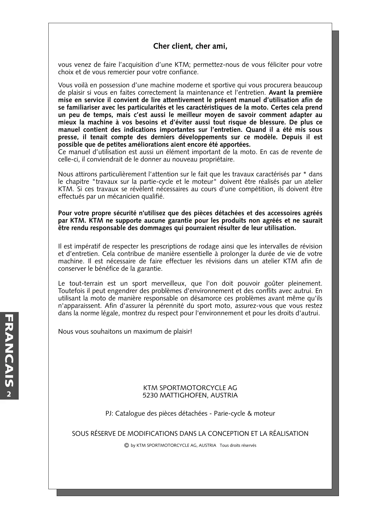 Cher client, cher ami, vous venez de faire l’acquisition d’une KTM; permettez-nous de vous féliciter pour votre choix et de vous remercier pour votre confiance. Vous voilà en possession d’une machine moderne et sportive qui vous procurera beaucoup de plaisir si vous en faites correctement la maintenance et l’entretien. Avant la première mise en service il convient de lire attentivement le présent manuel d’utilisation afin de se familiariser avec les particularités et les caractéristiques de la moto. Certes cela prend un peu de temps, mais c’est aussi le meilleur moyen de savoir comment adapter au mieux la machine à vos besoins et d’éviter aussi tout risque de blessure. De plus ce manuel contient des indications importantes sur l’entretien. Quand il a été mis sous presse, il tenait compte des derniers développements sur ce modèle. Depuis il est possible que de petites améliorations aient encore été apportées. Ce manuel d’utilisation est aussi un élément important de la moto. En cas de revente de celle-ci, il conviendrait de le donner au nouveau propriétaire. Nous attirons particulièrement l'attention sur le fait que les travaux caractérisés par * dans le chapitre "travaux sur la partie-cycle et le moteur" doivent être réalisés par un atelier KTM. Si ces travaux se révèlent nécessaires au cours d'une compétition, ils doivent être effectués par un mécanicien qualifié. Pour votre propre sécurité n'utilisez que des pièces détachées et des accessoires agréés par KTM. KTM ne supporte aucune garantie pour les produits non agréés et ne saurait être rendu responsable des dommages qui pourraient résulter de leur utilisation. Il est impératif de respecter les prescriptions de rodage ainsi que les intervalles de révision et d’entretien. Cela contribue de manière essentielle à prolonger la durée de vie de votre machine. Il est nécessaire de faire effectuer les révisions dans un atelier KTM afin de conserver le bénéfice de la garantie.