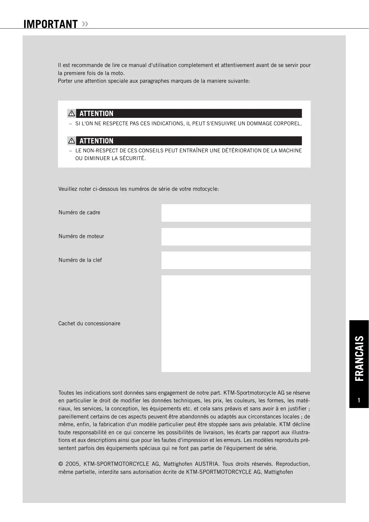 Toutes les indications sont données sans engagement de notre part. KTM-Sportmotorcycle AG se réserve en particulier le droit de modifier les données techniques, les prix, les couleurs, les formes, les matériaux, les services, la conception, les équipements etc. et cela sans préavis et sans avoir à en justifier ; pareillement certains de ces aspects peuvent être abandonnés ou adaptés aux circonstances locales ; de même, enfin, la fabrication d'un modèle particulier peut être stoppée sans avis préalable. KTM décline toute responsabilité en ce qui concerne les possibilités de livraison, les écarts par rapport aux illustrations et aux descriptions ainsi que pour les fautes d'impression et les erreurs. Les modèles reproduits présentent parfois des équipements spéciaux qui ne font pas partie de l'équipement de série. © 2005, KTM-SPORTMOTORCYCLE AG, Mattighofen AUSTRIA. Tous droits réservés. Reproduction, même partielle, interdite sans autorisation écrite de KTM-SPORTMOTORCYCLE AG, Mattighofen