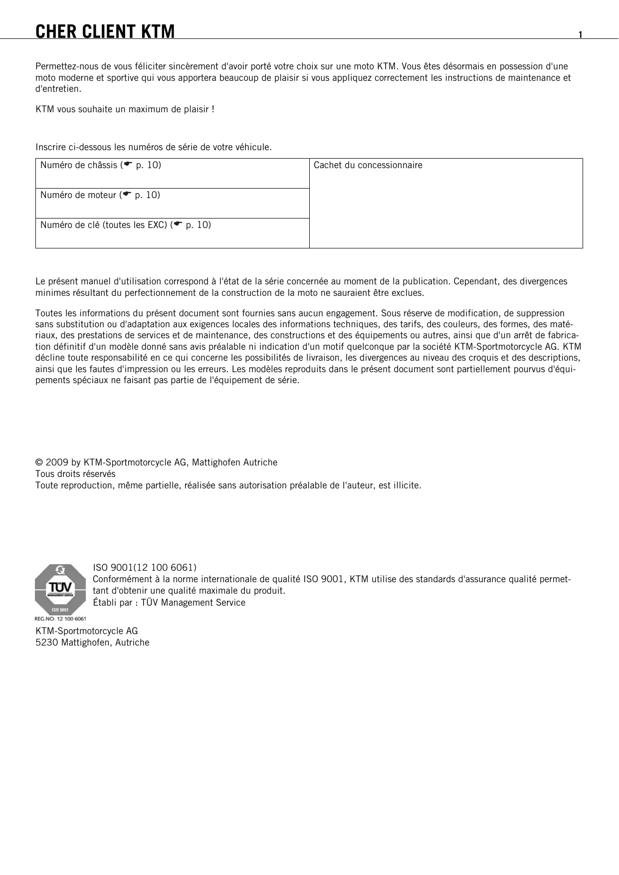 © 2009 by KTM-Sportmotorcycle AG, Mattighofen Autriche Tous droits réservés Toute reproduction, même partielle, réalisée sans autorisation préalable de l'auteur, est illicite.