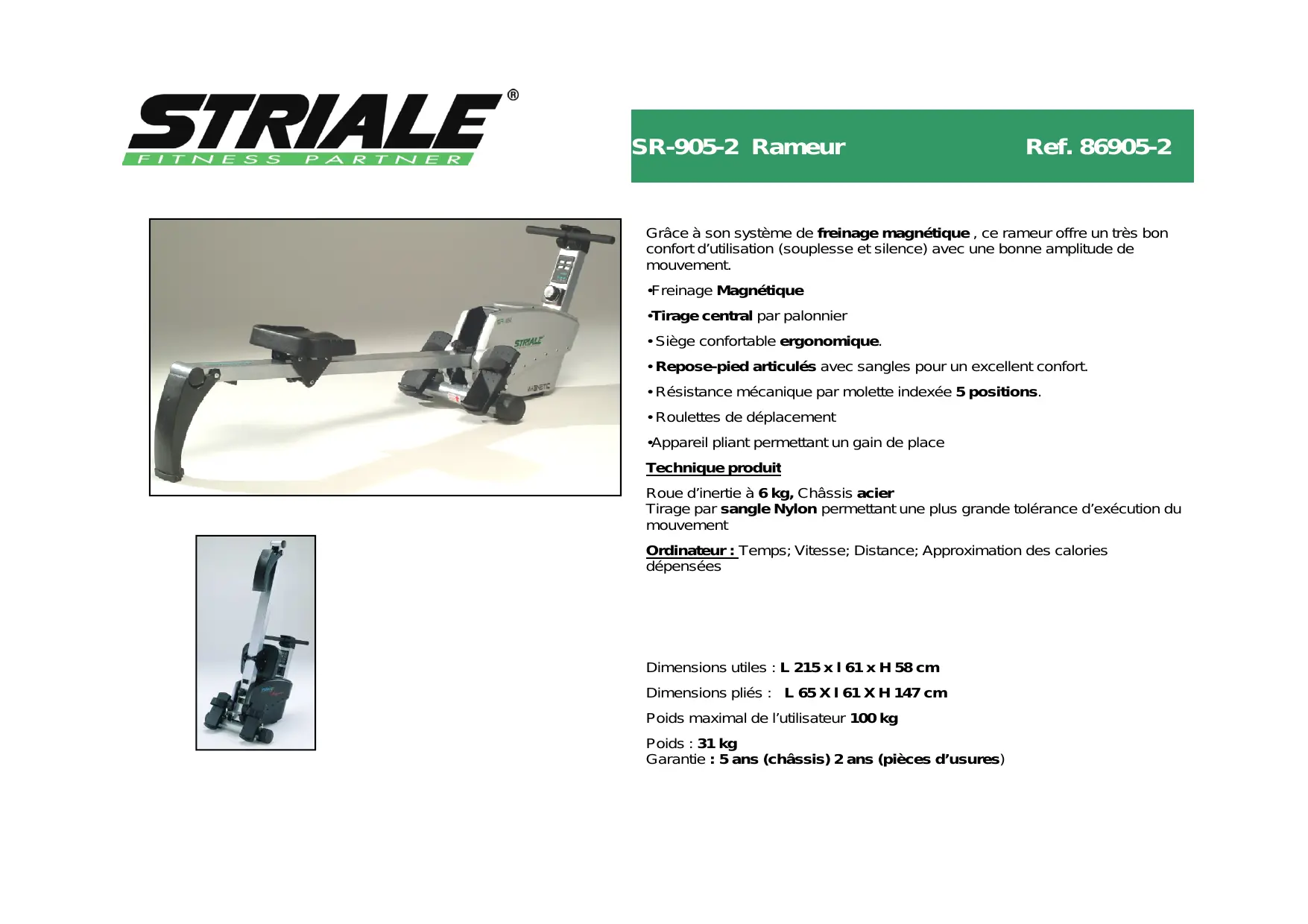 - Appareil pliant permettant un gain de place Technique produit Roue d’inertie à 6 kg, Châssis acier Tirage par sangle Nylon permettant une plus grande tolérance d’exécution du mouvement Ordinateur : Temps; Vitesse; Distance; Approximation des calories dépensées Dimensions utiles : L 215 x l 61 x H 58 cm Dimensions pliés : L 65 X l 61 X H 147 cm Poids maximal de l’utilisateur 100 kg Poids : 31 kg Garantie : 5 ans (châssis) 2 ans (pièces d’usures)