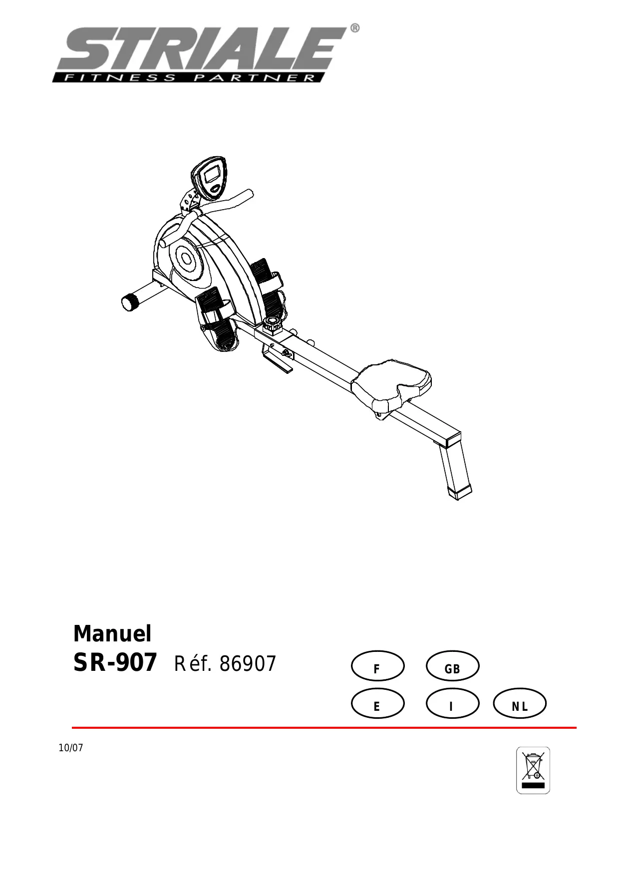 AVERTISSEMENTS : Sécurité - Lisez et conservez avec précaution ce manuel de l’utilisateur. N’utilisez ce produit que de la manière indiquée. - Cet appareil doit être assemblé et utilisé par des adultes. - Votre appareil est conforme à la norme EN-957 classe H pour une utilisation à domicile, il ne doit pas être utilisé dans une salle de sport ou tout autre lieu public, associatif ou locatif. - Pour une utilisation en toute sécurité une surface stable et plane est nécessaire. Protégez votre revêtement de sol par un tapis. Ne pas utiliser cet appareil dans un endroit humide (piscine, sauna, etc.). - Ne pas laisser jouer les enfants avec l’appareil. La société STRIALE décline toute responsabilité quant aux dommages qu’ils pourraient subir. Ne pas laisser les enfants à proximité de l’appareil pendant votre entraînement. - STRIALE décline toute responsabilité en cas de modifications techniques faites par l’utilisateur sur l’un de nos produits. - Poids et taille maximum de l’utilisateur : 110 kg. - Avant de commencer votre entraînement il est primordial de consulter votre médecin pour déterminer le niveau d’intensité de votre programme. Un entraînement excessif ou mal programmé peut nuire à la santé. - Gardez le dos droit lors des exercices. - Il est fortement recommandé de porter une tenue et des chaussures appropriées. - Tenez compte pour les parties réglables des positions maximales. - Il est impératif que le repose pied du côté où l’on s’installe soit en position basse. Il est aussi impératif de se tenir au guidon fixe durant cette phase d’installation. - Les repose pied de votre Elliptique doivent à l’arrêt lorsque vous souhaitez monter ou descendre du produit. Entretien - Vérifier régulièrement le serrage des éléments de fixation avec les vis et les écrous. Pour garder son niveau de sécurité, votre appareil doit être examiné régulièrement. Il est impératif de remplacer toute pièce défectueuse et de ne plus l’utiliser jusqu’à sa complète réparation. Penser au graissage régulier des pièces mobiles. - La sueur étant très corrosive ne pas laisser celle-ci entrer en contact avec les parties émaillées ou chromées de l'appareil, et particulièrement l'ordinateur, essuyer immédiatement votre appareil après entraînement. Le nettoyage des parties émaillées se fait à l’aide d’une éponge imprégnée d'eau. Tous produits agressifs ou corrosifs sont à proscrire. Garantie : Le châssis est garanti 5 ans. Les pièces d’usures sont garanties 2 ans. La garantie s’applique en utilisation normale par un particulier à domicile. Recyclage : le symbole « poubelle barrée » signifie que ce produit et les piles qu’il peut contenir ne peuvent être jetés avec les déchets domestiques. Ils font l’objet d’un tri sélectif spécifique. Déposez les batteries ainsi que votre produit électronique en fin de vie dans un espace de collecte autorisé afin de les recycler. Cette valorisation de vos déchets électroniques permettra la protection de l’environnement et de votre santé.