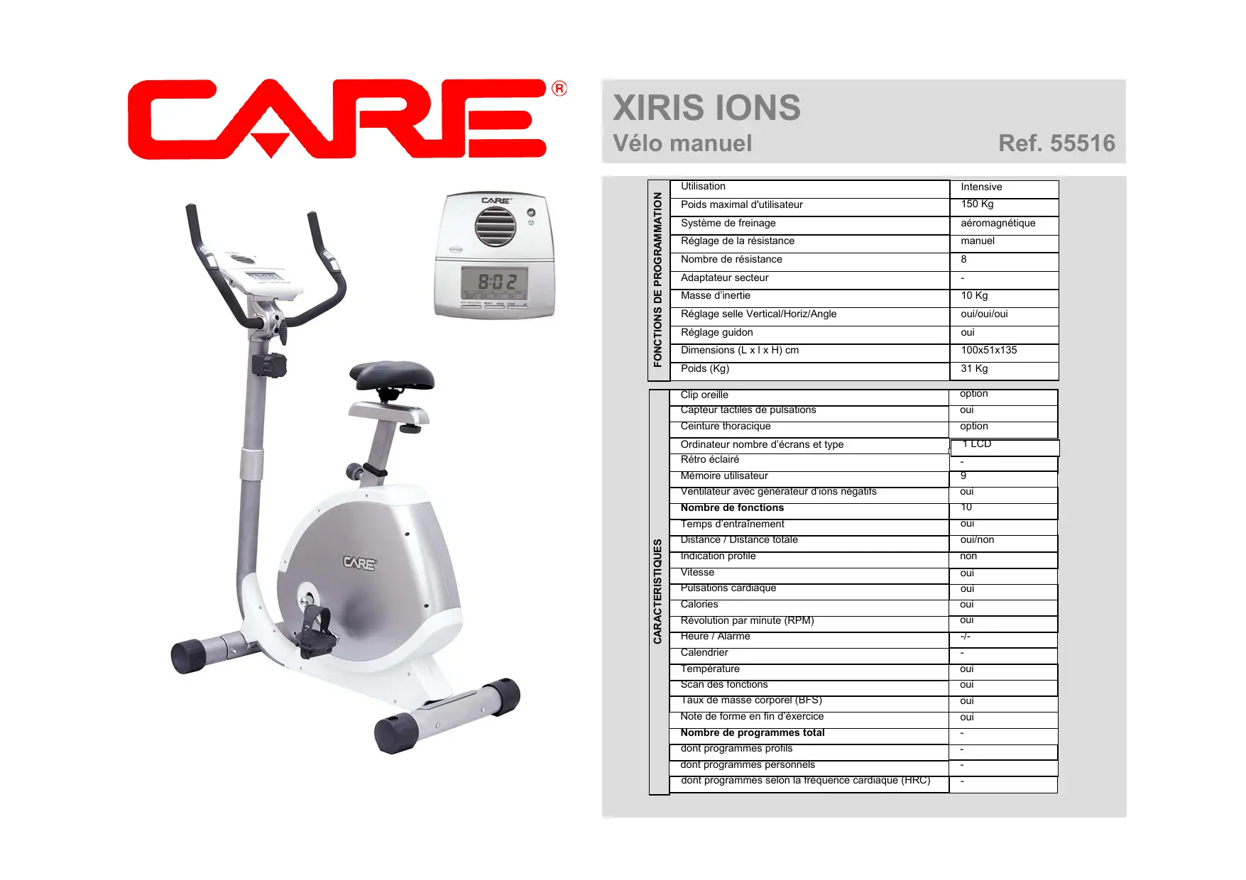 | Type de produit | Vélo d'appartement CARE FITNESS XIRIS IONS 55516 |