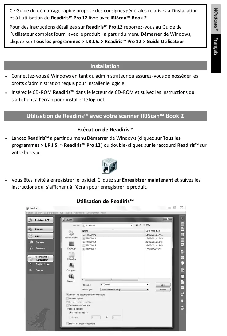 Ce Guide de démarrage rapide propose des consignes générales relatives à l'installation et à l'utilisation de Readiris™ Pro 12 livré avec IRIScan™ Book 2. Pour des instructions détaillées sur Readiris™ Pro 12 reportez-vous au Guide de l’utilisateur complet fourni avec le produit : à partir du menu Démarrer de Windows, cliquez sur Tous les programmes > I.R.I.S. > Readiris™ Pro 12 > Guide Utilisateur