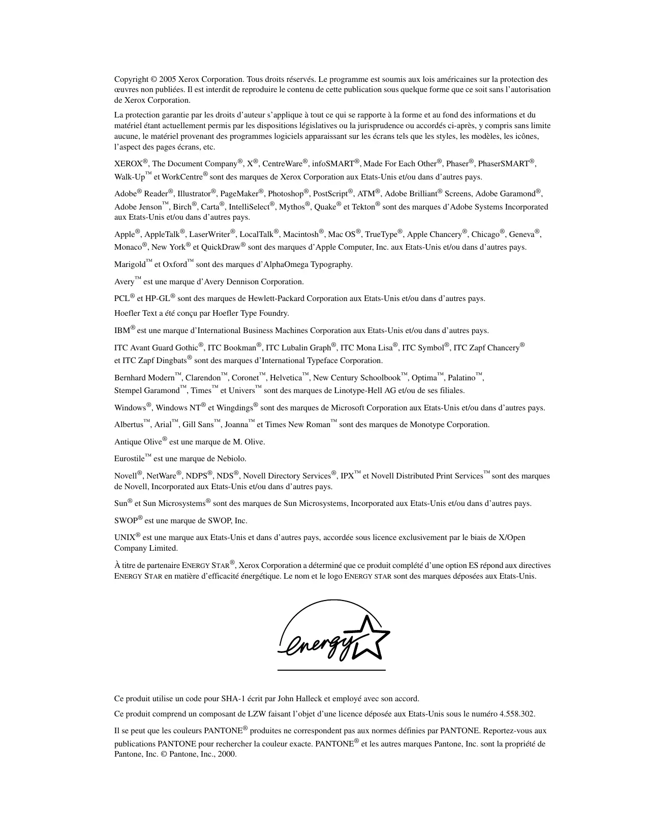 Copyright © 2005 Xerox Corporation. Tous droits réservés. Le programme est soumis aux lois américaines sur la protection des œuvres non publiées. Il est interdit de reproduire le contenu de cette publication sous quelque forme que ce soit sans l’autorisation de Xerox Corporation. La protection garantie par les droits d’auteur s’applique à tout ce qui se rapporte à la forme et au fond des informations et du matériel étant actuellement permis par les dispositions législatives ou la jurisprudence ou accordés ci-après, y compris sans limite aucune, le matériel provenant des programmes logiciels apparaissant sur les écrans tels que les styles, les modèles, les icônes, l’aspect des pages écrans, etc. XEROX®, The Document Company®, X®, CentreWare®, infoSMART®, Made For Each Other®, Phaser®, PhaserSMART®, Walk-Up™ et WorkCentre® sont des marques de Xerox Corporation aux Etats-Unis et/ou dans d’autres pays. Adobe® Reader®, Illustrator®, PageMaker®, Photoshop®, PostScript®, ATM®, Adobe Brilliant® Screens, Adobe Garamond®, Adobe Jenson™, Birch®, Carta®, IntelliSelect®, Mythos®, Quake® et Tekton® sont des marques d’Adobe Systems Incorporated aux Etats-Unis et/ou dans d’autres pays. Apple®, AppleTalk®, LaserWriter®, LocalTalk®, Macintosh®, Mac OS®, TrueType®, Apple Chancery®, Chicago®, Geneva®, Monaco®, New York® et QuickDraw® sont des marques d’Apple Computer, Inc. aux Etats-Unis et/ou dans d’autres pays. Marigold™ et Oxford™ sont des marques d’AlphaOmega Typography. Avery™ est une marque d’Avery Dennison Corporation. PCL® et HP-GL® sont des marques de Hewlett-Packard Corporation aux Etats-Unis et/ou dans d’autres pays. Hoefler Text a été conçu par Hoefler Type Foundry. IBM® est une marque d’International Business Machines Corporation aux Etats-Unis et/ou dans d’autres pays. ITC Avant Guard Gothic®, ITC Bookman®, ITC Lubalin Graph®, ITC Mona Lisa®, ITC Symbol®, ITC Zapf Chancery® et ITC Zapf Dingbats® sont des marques d’International Typeface Corporation. Bernhard Modern™, Clarendon™, Coronet™, Helvetica™, New Century Schoolbook™, Optima™, Palatino™, Stempel Garamond™, Times™ et Univers™ sont des marques de Linotype-Hell AG et/ou de ses filiales. Windows®, Windows NT® et Wingdings® sont des marques de Microsoft Corporation aux Etats-Unis et/ou dans d’autres pays. Albertus™, Arial™, Gill Sans™, Joanna™ et Times New Roman™ sont des marques de Monotype Corporation. Antique Olive® est une marque de M. Olive. Eurostile™ est une marque de Nebiolo. Novell®, NetWare®, NDPS®, NDS®, Novell Directory Services®, IPX™ et Novell Distributed Print Services™ sont des marques de Novell, Incorporated aux Etats-Unis et/ou dans d’autres pays. Sun® et Sun Microsystems® sont des marques de Sun Microsystems, Incorporated aux Etats-Unis et/ou dans d’autres pays. SWOP® est une marque de SWOP, Inc. UNIX® est une marque aux Etats-Unis et dans d’autres pays, accordée sous licence exclusivement par le biais de X/Open Company Limited. À titre de partenaire ENERGY STAR®, Xerox Corporation a déterminé que ce produit complété d’une option ES répond aux directives ENERGY STAR en matière d’efficacité énergétique. Le nom et le logo ENERGY STAR sont des marques déposées aux Etats-Unis.
