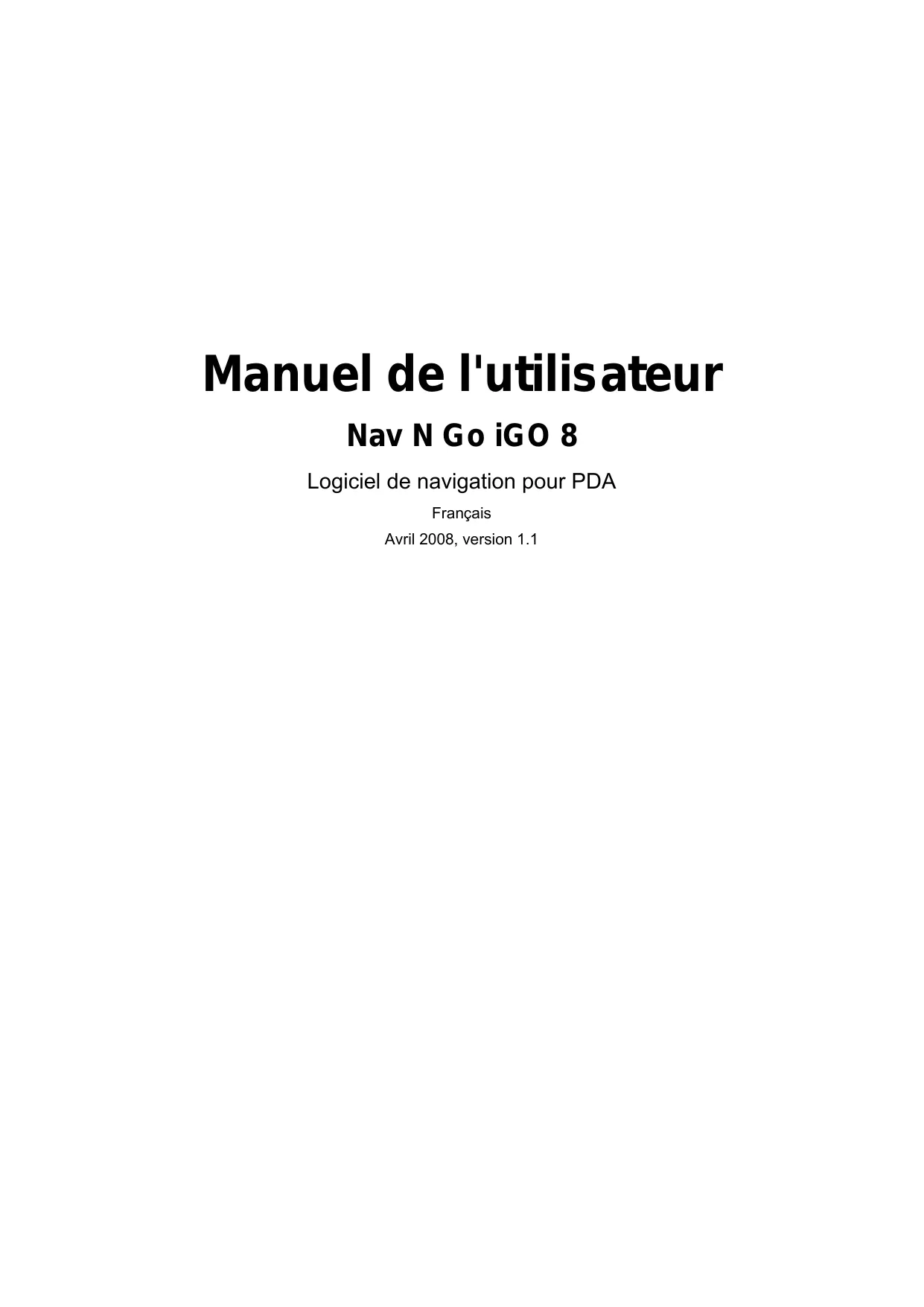 Manuel de l'utilisateur Nav N Go iGO 8 Logiciel de navigation pour PDA Français Avril 2008, version 1.1 Note sur le droit d'auteur Ce produit et les informations ci-dessous peuvent être modifiés sans notification préalable. Le présent manuel ne peut être ni reproduit ni transmis, dans son intégralité ou dans chacune de ses parties, électroniquement ou mécaniquement, photocopie y compris, sans l'autorisation écrite expresse de Nav N Go Kft.. © 2008 - Nav N Go Kft. Les données de cartes Whereis® appartiennent à © 2006 Telstra Corporation Limited et ses concédants Data Source © 2006, Tele Atlas N.V. Autriche : © BEV, GZ 1368/2003 Danemark : © DAV France : © IGN France GrandeOrdnance Survey data with permission of Her Majesty's Stationery Office © Bretagne : Crown Copyright Italie : © Geonext/DeAgostini Irlande du Nord : © Ordnance Survey of Northern Ireland Norvège : © Norwegian Mapping Authority, Public Roads Administration / Mapsolutions Suisse : © Swisstopo Pays-Bas : Topografische ondergrond Copyright © dienst voor het kadaster en de openbare registers, Apeldorn Tous droits réservés. Merci d'avoir choisi Nav N Go iGO 8 comme navigateur porte à porte embarqué. Lisez tout d'abord le manuel de démarrage Express, puis commencez à utiliser Nav N Go iGO 8. Ce document constitue la description détaillée du logiciel. Vous pouvez aisément découvrir Nav N Go iGO 8 tout en l'utilisant. Nous vous conseillons cependant de lire ce manuel pour vous familiariser avec les écrans et les fonctions de Nav N Go iGO 8.
