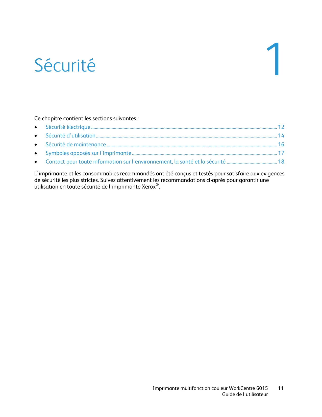 Imprimante multifonction couleur WorkCentre 6015 Guide de l'utilisateur Recyclage et mise au rebut Amérique du Nord Xerox a mis en place un programme international de reprise et de réutilisation/recyclage des équipements. Contactez Xerox pour déterminer si ce produit Xerox® fait partie du programme. Pour plus d'informations sur les programmes Xerox® de protection de l'environnement, consultez le site Web www.xerox.com/environment. Pour en savoir plus sur les programmes de recyclage et de mise au rebut, prenez contact avec les autorités locales. Imprimante multifonction couleur WorkCentre 6015 Guide de l'utilisateur