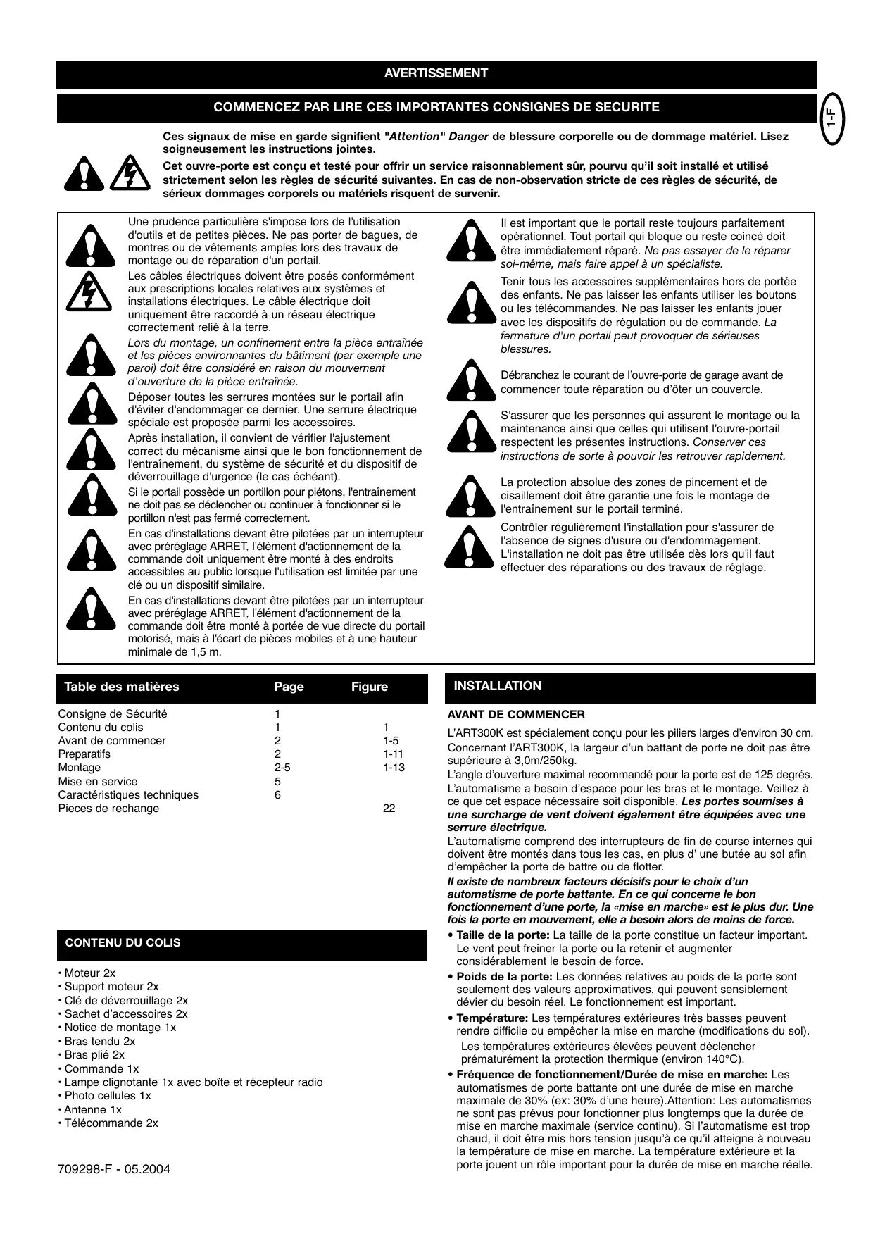 COMMENCEZ PAR LIRE CES IMPORTANTES CONSIGNES DE SECURITE Ces signaux de mise en garde signifient "Attention" Danger de blessure corporelle ou de dommage matériel. Lisez soigneusement les instructions jointes. Cet ouvre-porte est conçu et testé pour offrir un service raisonnablement sûr, pourvu qu’il soit installé et utilisé strictement selon les règles de sécurité suivantes. En cas de non-observation stricte de ces règles de sécurité, de sérieux dommages corporels ou matériels risquent de survenir. Une prudence particulière s'impose lors de l'utilisation d'outils et de petites pièces. Ne pas porter de bagues, de montres ou de vêtements amples lors des travaux de montage ou de réparation d'un portail. Les câbles électriques doivent être posés conformément aux prescriptions locales relatives aux systèmes et installations électriques. Le câble électrique doit uniquement être raccordé à un réseau électrique correctement relié à la terre. Lors du montage, un confinement entre la pièce entraînée et les pièces environnantes du bâtiment (par exemple une paroi) doit être considéré en raison du mouvement d'ouverture de la pièce entraînée. Déposer toutes les serrures montées sur le portail afin d'éviter d'endommager ce dernier. Une serrure électrique spéciale est proposée parmi les accessoires. Après installation, il convient de vérifier l'ajustement correct du mécanisme ainsi que le bon fonctionnement de l'entraînement, du système de sécurité et du dispositif de déverrouillage d'urgence (le cas échéant). Si le portail possède un portillon pour piétons, l'entraînement ne doit pas se déclencher ou continuer à fonctionner si le portillon n'est pas fermé correctement. En cas d'installations devant être pilotées par un interrupteur avec préréglage ARRET, l'élément d'actionnement de la commande doit uniquement être monté à des endroits accessibles au public lorsque l'utilisation est limitée par une clé ou un dispositif similaire. En cas d'installations devant être pilotées par un interrupteur avec préréglage ARRET, l'élément d'actionnement de la commande doit être monté à portée de vue directe du portail motorisé, mais à l'écart de pièces mobiles et à une hauteur minimale de 1,5 m.