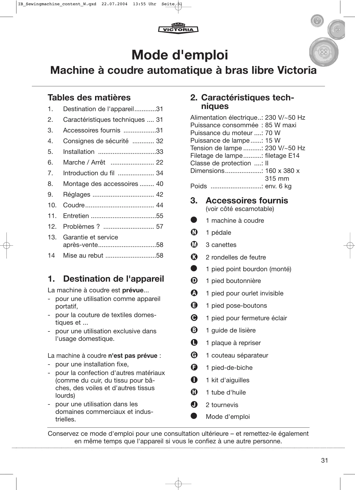 Tout comme avec n'importe quel autre apparéil électrique, l'usage d'une machine à coudre peut se blesser avec l' apparéil ou courir un danger de mort. Afin d'éviter des situations à risques et travailler en toute sécurité :