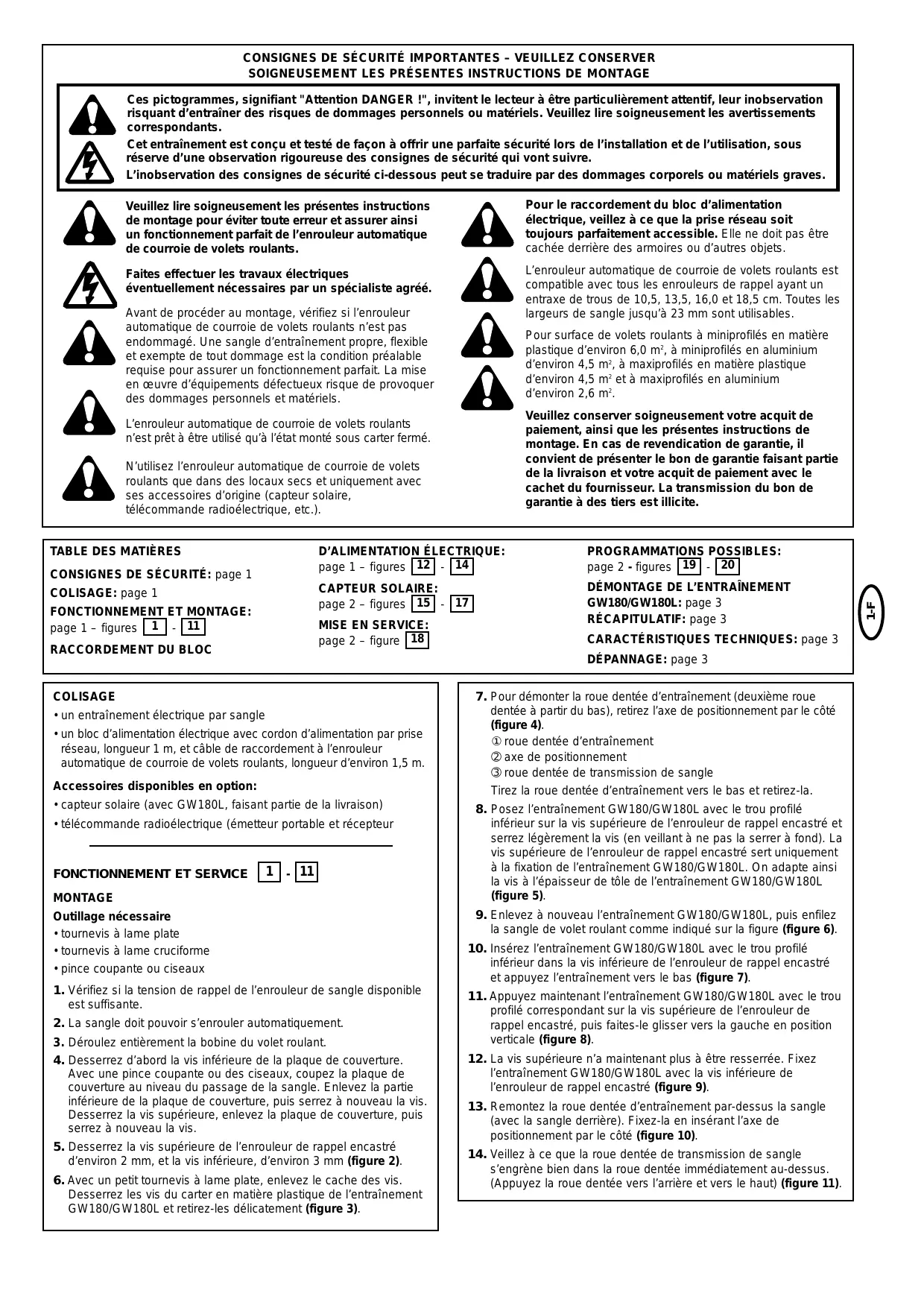 CONSIGNES DE SÉCURITÉ IMPORTANTES – VEUILLEZ CONSERVER SOIGNEUSEMENT LES PRÉSENTES INSTRUCTIONS DE MONTAGE Ces pictogrammes, signifiant "Attention DANGER !", invitent le lecteur à être particulièrement attentif, leur inobservation risquant d’entraîner des risques de dommages personnels ou matériels. Veuillez lire soigneusement les avertissements correspondants. Cet entraînement est conçu et testé de façon à offrir une parfaite sécurité lors de l’installation et de l’utilisation, sous réserve d’une observation rigoureuse des consignes de sécurité qui vont suivre. L’inobservation des consignes de sécurité ci-dessous peut se traduire par des dommages corporels ou matériels graves. Veuillez lire soigneusement les présentes instructions de montage pour éviter toute erreur et assurer ainsi un fonctionnement parfait de l’enrouleur automatique de courroie de volets roulants.