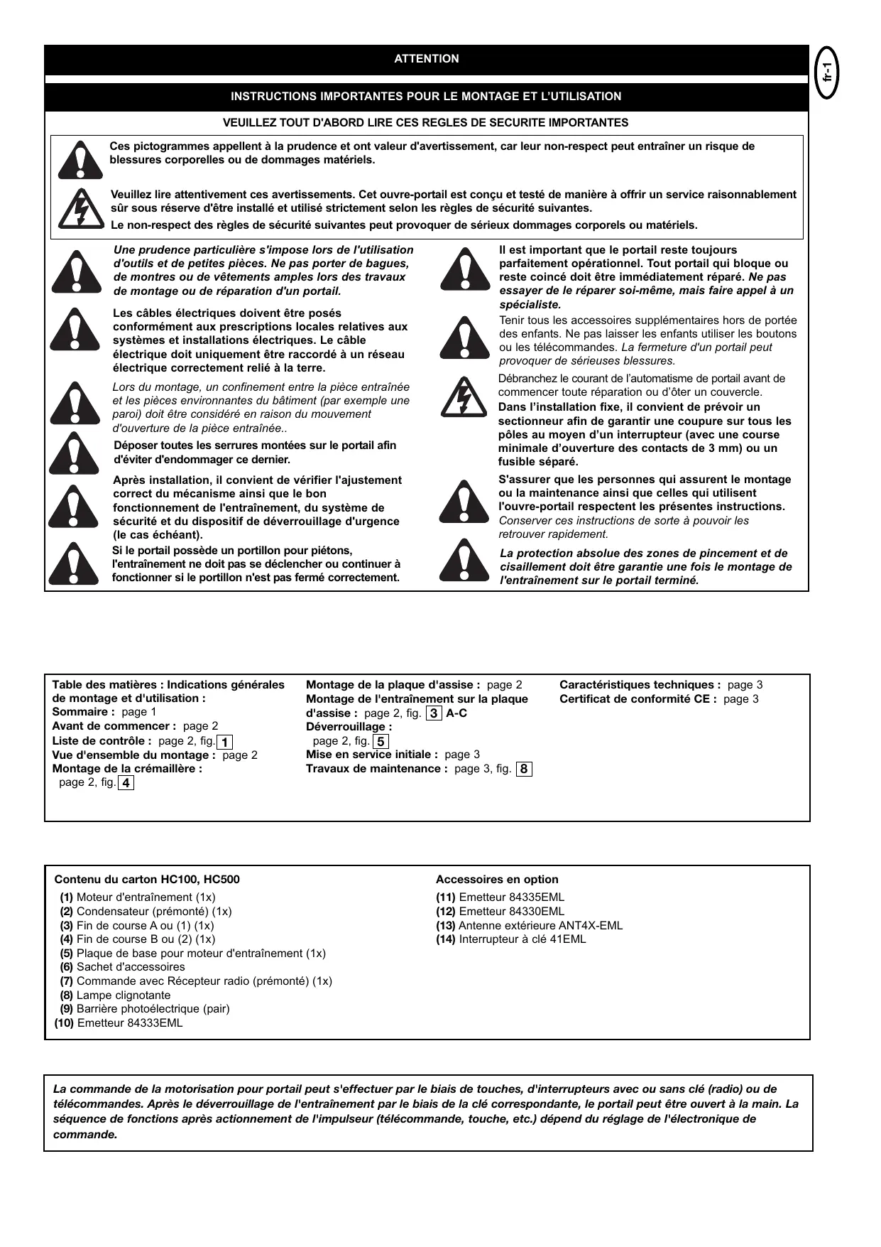 300kg 500kg Konformitätserklärung Automatische Torantriebe Modelle HC100ML-2, HC500ML-2 Series erfüllt die Anforderungen der geltenden Abschnitte der Normenvorschriften EN300220-3 • EN55014 • EN61000-3 • EN60555, EN60335-1 • ETS 300 683 • EN60335-1: 2002 • EN60335-2-103: 2003 • EN55014-1: 2000 + A1 + A2 • EN55014-2: 2001 • EN61000-3-2: 2000 • EN61000-3-3: 1995 + A1 • EN 301 489-3, V1.3.1 • EN 300 220-3 V1.1.1 • EN 13241-1 sowie die Bestimmungen und sämtliche Ergänzungen der EU-Vorschriften ..............................................2006/95/EC, 2004/108/EC, 1999/5/EG Einschlußerklärung Die automatischen Torantriebe, erfüllen die Bestimmungen der EU-Vorschrift 89/393/EEC und ihre Ergänzungen, wenn sie gemäß den Anleitungen des Herstellers installiert und gewartet werden und wenn sie mit einem Tor verwendet werden, das ebenfalls gemäß Herstelleranleitungen installiert wurde und gewartet wird. Die Unterzeichnende erklärt hiermit, dass das vorstehend angegebenne Gerät sowie sämtliches im Handbuch aufgeführtes Zubehör den oben genannten Vorschriften und Normen entspricht. B.P.Kelkhoff Manager, Regulatory Affairs Chamberlain GmbH D-66793 Saarwellingen Januar, 2008 709432F-de © 2008, Chamberlain GmbH de-3 ERSTE INBETRIEBNAHME fr-1 ATTENTION INSTRUCTIONS IMPORTANTES POUR LE MONTAGE ET L’UTILISATION VEUILLEZ TOUT D'ABORD LIRE CES REGLES DE SECURITE IMPORTANTES Ces pictogrammes appellent à la prudence et ont valeur d'avertissement, car leur non-respect peut entraîner un risque de blessures corporelles ou de dommages matériels. Veuillez lire attentivement ces avertissements. Cet ouvre-portail est conçu et testé de manière à offrir un service raisonnablement sûr sous réserve d'être installé et utilisé strictement selon les règles de sécurité suivantes. Le non-respect des règles de sécurité suivantes peut provoquer de sérieux dommages corporels ou matériels. Une prudence particulière s'impose lors de l'utilisation d'outils et de petites pièces. Ne pas porter de bagues, de montres ou de vêtements amples lors des travaux de montage ou de réparation d'un portail. Les câbles électriques doivent être posés conformément aux prescriptions locales relatives aux systèmes et installations électriques. Le câble électrique doit uniquement être raccordé à un réseau électrique correctement relié à la terre. Lors du montage, un confinement entre la pièce entraînée et les pièces environnantes du bâtiment (par exemple une paroi) doit être considéré en raison du mouvement d'ouverture de la pièce entraînée.. Déposer toutes les serrures montées sur le portail afin d'éviter d'endommager ce dernier. Après installation, il convient de vérifier l'ajustement correct du mécanisme ainsi que le bon fonctionnement de l'entraînement, du système de sécurité et du dispositif de déverrouillage d'urgence (le cas échéant). Si le portail possède un portillon pour piétons, l'entraînement ne doit pas se déclencher ou continuer à fonctionner si le portillon n'est pas fermé correctement. Table des matières : Indications générales de montage et d'utilisation : Sommaire : page 1 Avant de commencer : page 2 Liste de contrôle : page 2, fig. 1 Vue d'ensemble du montage : page 2 Montage de la crémaillère : page 2, fig. 4 Il est important que le portail reste toujours parfaitement opérationnel. Tout portail qui bloque ou reste coincé doit être immédiatement réparé. Ne pas essayer de le réparer soi-même, mais faire appel à un spécialiste. Tenir tous les accessoires supplémentaires hors de portée des enfants. Ne pas laisser les enfants utiliser les boutons ou les télécommandes. La fermeture d'un portail peut provoquer de sérieuses blessures. Débranchez le courant de l’automatisme de portail avant de commencer toute réparation ou d’ôter un couvercle. Dans l’installation fixe, il convient de prévoir un sectionneur afin de garantir une coupure sur tous les pôles au moyen d’un interrupteur (avec une course minimale d’ouverture des contacts de 3 mm) ou un fusible séparé. S'assurer que les personnes qui assurent le montage ou la maintenance ainsi que celles qui utilisent l'ouvre-portail respectent les présentes instructions. Conserver ces instructions de sorte à pouvoir les retrouver rapidement. La protection absolue des zones de pincement et de cisaillement doit être garantie une fois le montage de l'entraînement sur le portail terminé. Montage de la plaque d'assise : page 2 Montage de l'entraînement sur la plaque d'assise : page 2, fig. 3 A-C Déverrouillage : page 2, fig. 5 Mise en service initiale : page 3 Travaux de maintenance : page 3, fig. 8 Caractéristiques techniques : page 3 Certificat de conformité CE : page 3 Contenu du carton HC100, HC500 Accessoires en option (1) Moteur d'entraînement (1x) (2) Condensateur (prémonté) (1x) (3) Fin de course A ou (1) (1x) (4) Fin de course B ou (2) (1x) (5) Plaque de base pour moteur d'entraînement (1x) (6) Sachet d'accessoires (7) Commande avec Récepteur radio (prémonté) (1x) (8) Lampe clignotante (9) Barrière photoélectrique (pair) (10) Emetteur 84333EML (11) Emetteur 84335EML (12) Emetteur 84330EML (13) Antenne extérieure ANT4X-EML (14) Interrupteur à clé 41EML La commande de la motorisation pour portail peut s'effectuer par le biais de touches, d'interrupteurs avec ou sans clé (radio) ou de télécommandes. Après le déverrouillage de l'entraînement par le biais de la clé correspondante, le portail peut être ouvert à la main. La séquence de fonctions après actionnement de l'impulseur (télécommande, touche, etc.) dépend du réglage de l'électronique de commande. Il existe de nombreux facteurs décisifs pour le choix d’un automatisme de portail coulissant. En ce qui concerne le bon fonctionnement d’un portail, la «mise en marche» est le plus dur. Une fois en mouvement, il aura ensuite besoin de moins de force.