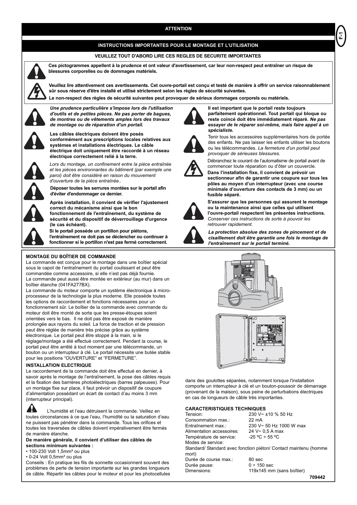 La commande du moteur comporte un système électronique à micro- processeur de la technologie la plus moderne. Elle possède toutes les options de raccordement et fonctions nécessaires pour un fonctionnement sûr. Le boîtier de la commande avec commande du moteur doit être monté de sorte que les presse-étoupes soient orientées vers le bas. Il ne doit pas être exposé de manière prolongée aux rayons du soleil. La force de traction et de pression peut être réglée de manière très précise grâce au système électronique. Le portail peut être stoppé à la main, si le réglage/montage a été effectué correctement. Pendant la course, le portail peut être arrêté à tout moment par une télécommande, un bouton où un interrupteur à clé. Le portail nécessite une butée stable pour les positions “OUVERTURE” et “FERMETURE”.