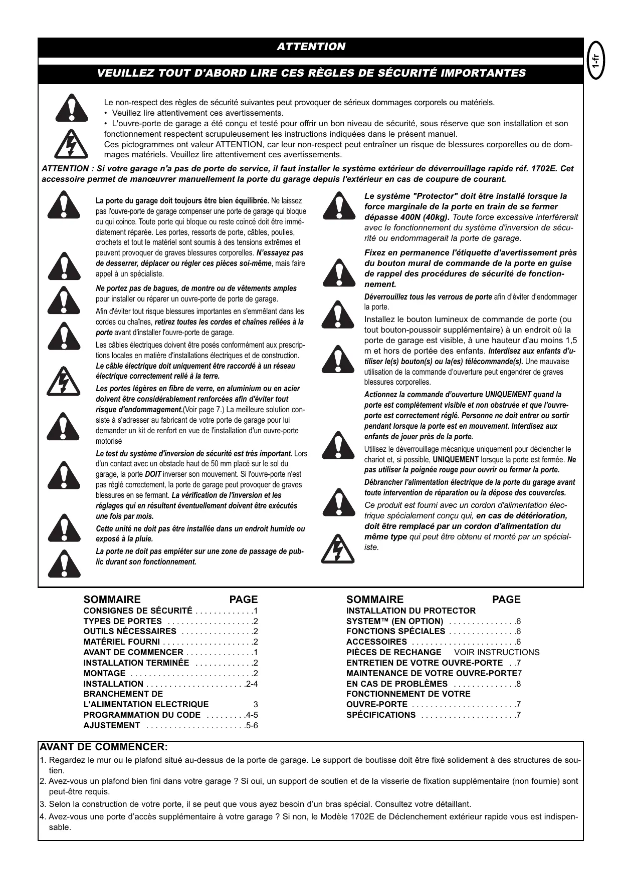SOMMAIRE PAGE CONSIGNES DE SÉCURITÉ . . . . . . . . . . . . .1 TYPES DE PORTES . . . . . . . . . . . . . . . . . . .2 OUTILS NÉCESSAIRES . . . . . . . . . . . . . . . .2 MATÉRIEL FOURNI . . . . . . . . . . . . . . . . . . . .2 AVANT DE COMMENCER . . . . . . . . . . . . . . .1 INSTALLATION TERMINÉE . . . . . . . . . . . . .2 MONTAGE . . . . . . . . . . . . . . . . . . . . . . . . . . .2 INSTALLATION . . . . . . . . . . . . . . . . . . . . . .2-4 BRANCHEMENT DE L'ALIMENTATION ELECTRIQUE 3 PROGRAMMATION DU CODE . . . . . . . . .4-5 AJUSTEMENT . . . . . . . . . . . . . . . . . . . . . .5-6