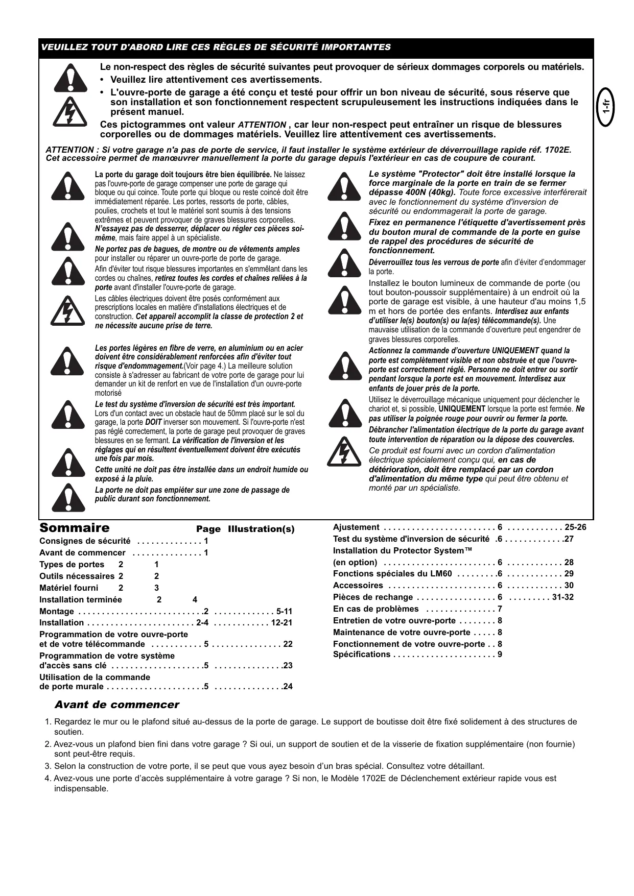 Sommaire Page Consignes de sécurité 1 Avant de commencer 1 Types de portes 2 1 Outils nécessaires 2 2 Matériel fourni 2 3 Installation terminée 2 Montage ..…. Installation Programmation de votre ouvre-porte et de votre télécommande Programmation de votre système d'accès sans clé .. Utilisation de la commande de porte murale ..….