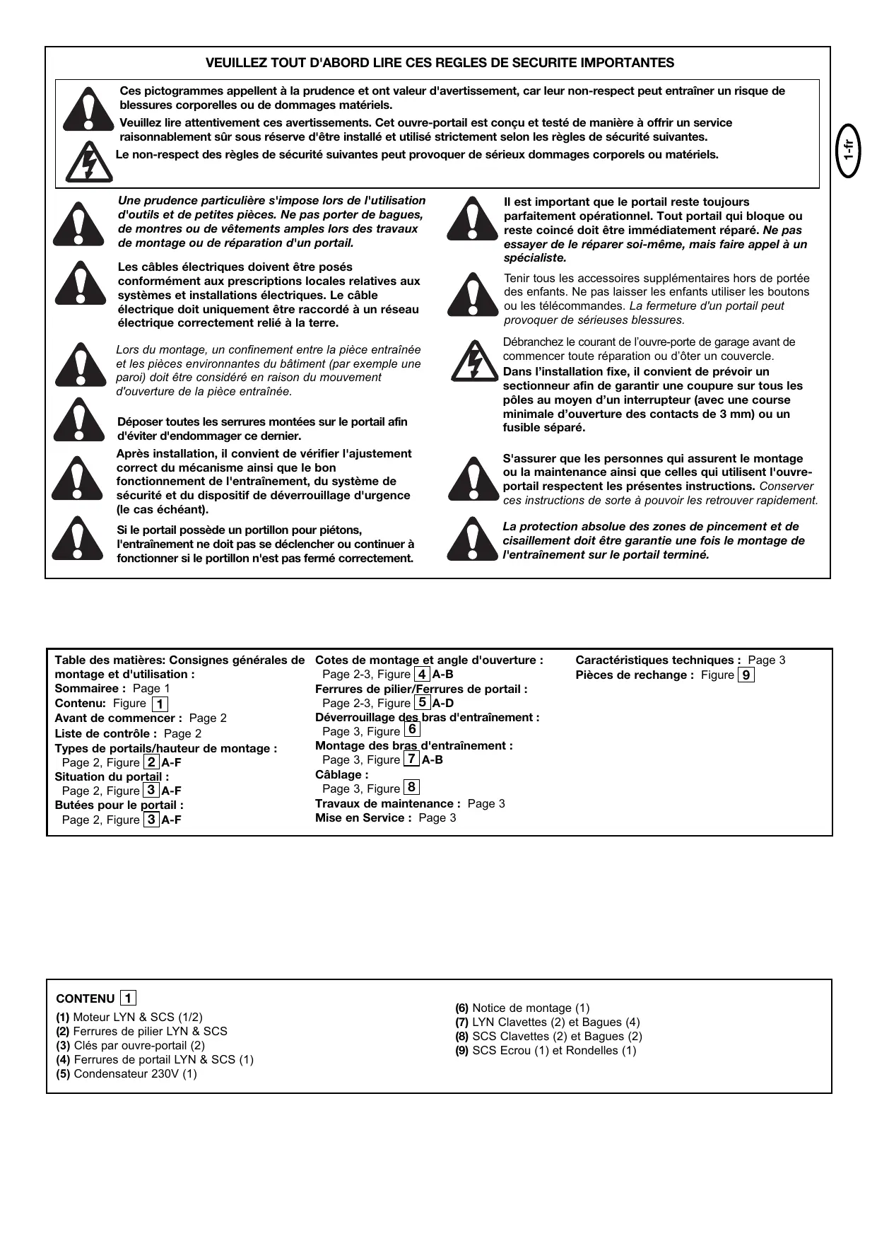 Page 2-3, Figure 4 A-B montage et d'utilisation : Sommairee : Page 1 Ferrures de pilier/Ferrures de portail : Page 2-3, Figure 5 A-D Contenu: Figure 1 Déverrouillage des bras d'entraînement : Avant de commencer : Page 2 Page 3, Figure 6 Liste de contrôle : Page 2 Montage des bras d'entraînement : Types de portails/hauteur de montage : Page 3, Figure 7 A-B Page 2, Figure 2 A-F Câblage : Situation du portail : Page 3, Figure 8 Page 2, Figure 3 A-F Travaux de maintenance : Page 3 Butées pour le portail : Mise en Service : Page 3