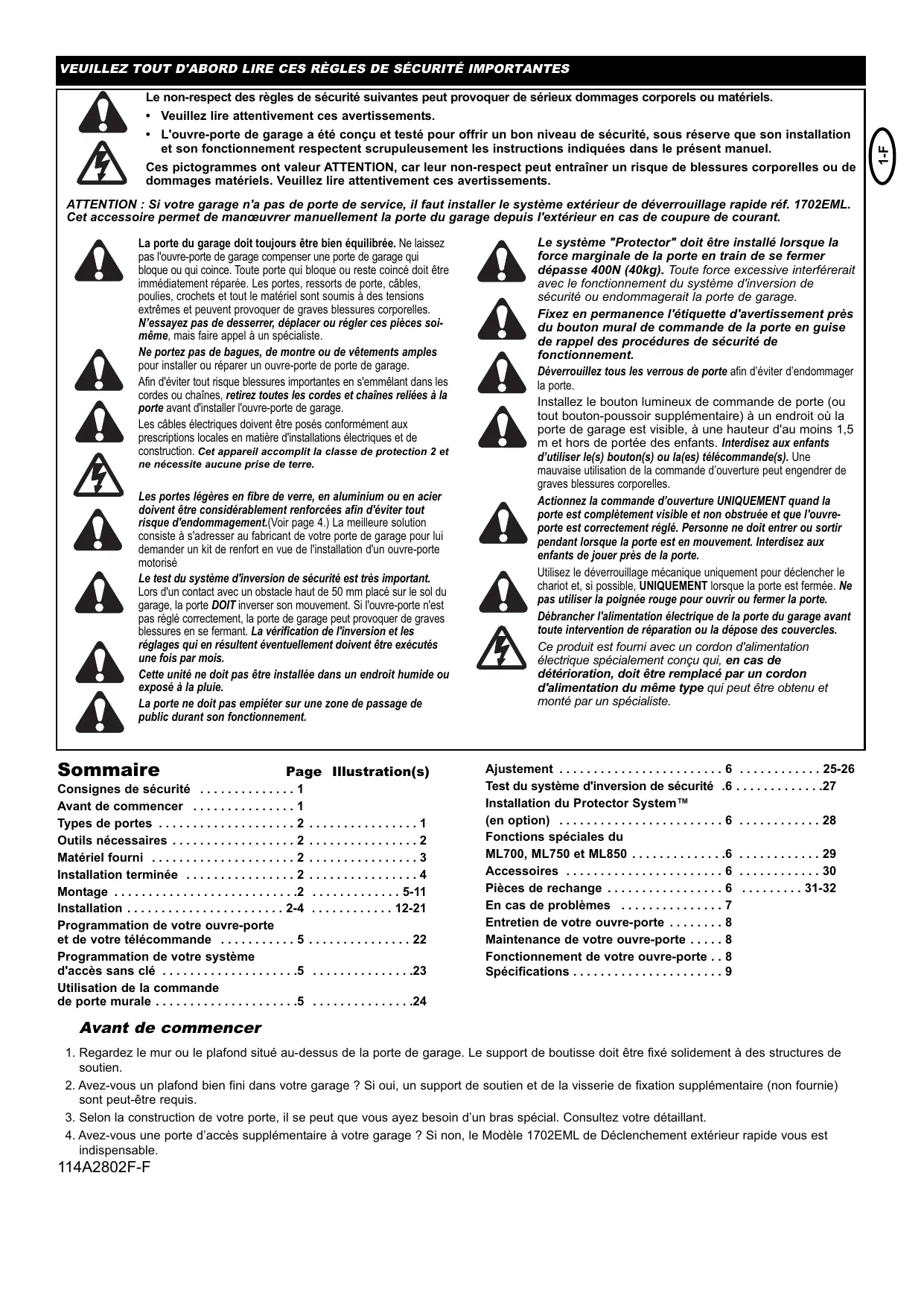 114A2802F-F L'utilisation inadéquate de l'ouvre-porte peut entraîner des blessures corporelles graves dues à une porte de garage en mouvement. Ne laissez pas les enfants manipuler le bouton de commande de porte ou l'émetteur à distance (télécommande).