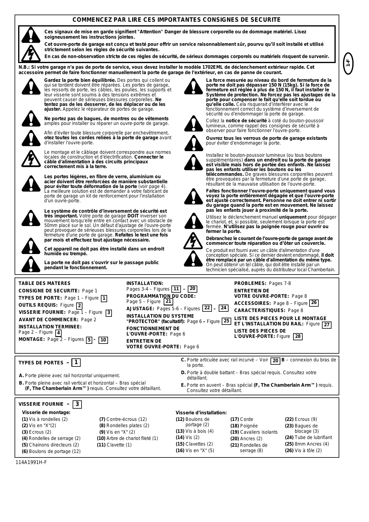 1-F Ces signaux de mise en garde signifient "Attention" Danger de blessure corporelle ou de dommage matériel. Lisez soigneusement les instructions jointes. Cet ouvre-porte de garage est conçu et testé pour offrir un service raisonnablement sûr, pourvu qu’il soit installé et utilisé strictement selon les règles de sécurité suivantes. En cas de non-observation stricte de ces règles de sécurité, de sérieux dommages corporels ou matériels risquent de survenir.