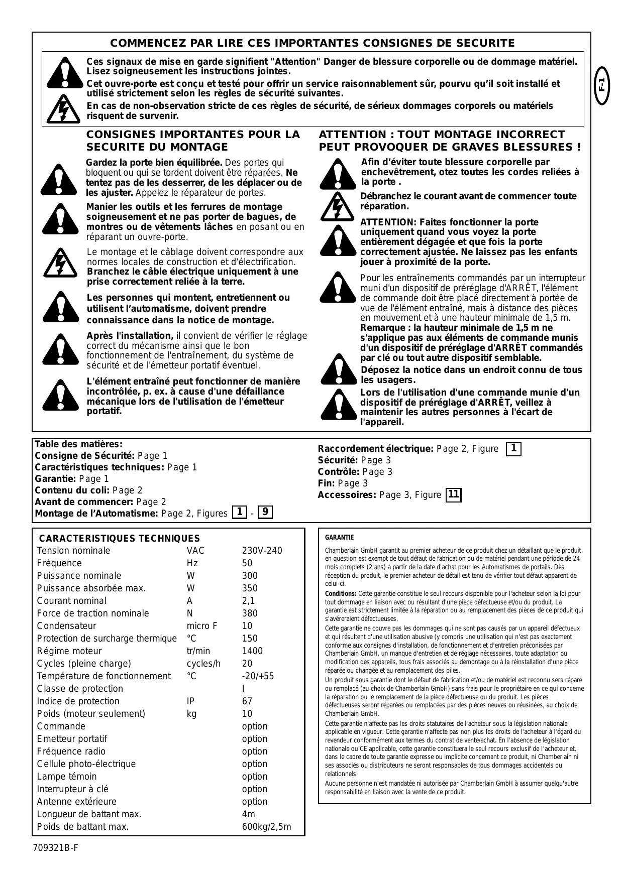 Consigne de Sécurité: Page 1 Caractéristiques techniques: Page 1 Garantie: Page 1 Contenu du coli: Page 2 Avant de commencer: Page 2 Montage de l’Automatisme: Page 2, Figures 1 - 9 CARACTERISTIQUES TECHNIQUES Tension nominale VAC Fréquence Cette garantie ne couvre pas les dommages qui ne sont pas causés par un appareil défectueux et qui résultent d'une utilisation abusive (y compris une utilisation qui n'est pas exactement conforme aux consignes d'installation, de fonctionnement et d'entretien préconisées par Chamberlain GmbH, un manque d'entretien et de réglage nécessaires, toute adaptation ou modification des appareils, tous frais associés au démontage ou à la réinstallation d'une pièce réparée ou changée et au remplacement des piles. Un produit sous garantie dont le défaut de fabrication et/ou de matériel est reconnu sera réparé ou remplacé (au choix de Chamberlain GmbH) sans frais pour le propriétaire en ce qui conceme la réparation ou le remplacement de la pièce défectueuse ou du produit. Les pièces défectueuses seront réparées ou remplacées par des pièces neuves ou réusinées, au choix de Chamberlain GmbH. Cette garantie n'affecte pas les droits statutaires de l'acheteur sous la législation nationale applicable en vigueur. Cette garantie n'affecte pas non plus les droits de l'acheteur à l'égard du revendeur conformément aux termes du contrat de vente/achat. En l'absence de législation nationale ou CE applicable, cette garantie constituera le seul recours exclusif de I'acheteur et, dans le cadre de toute garantie expresse ou implicite concernant ce produit, ni Chamberlain ni ses associés ou distributeurs ne seront responsables de tous dommages accidentels ou relationnels. Aucune personne n'est mandatée ni autorisée par Chamberlain GmbH à assumer quelqu'autre responsabilité en liaison avec la vente de ce produit.