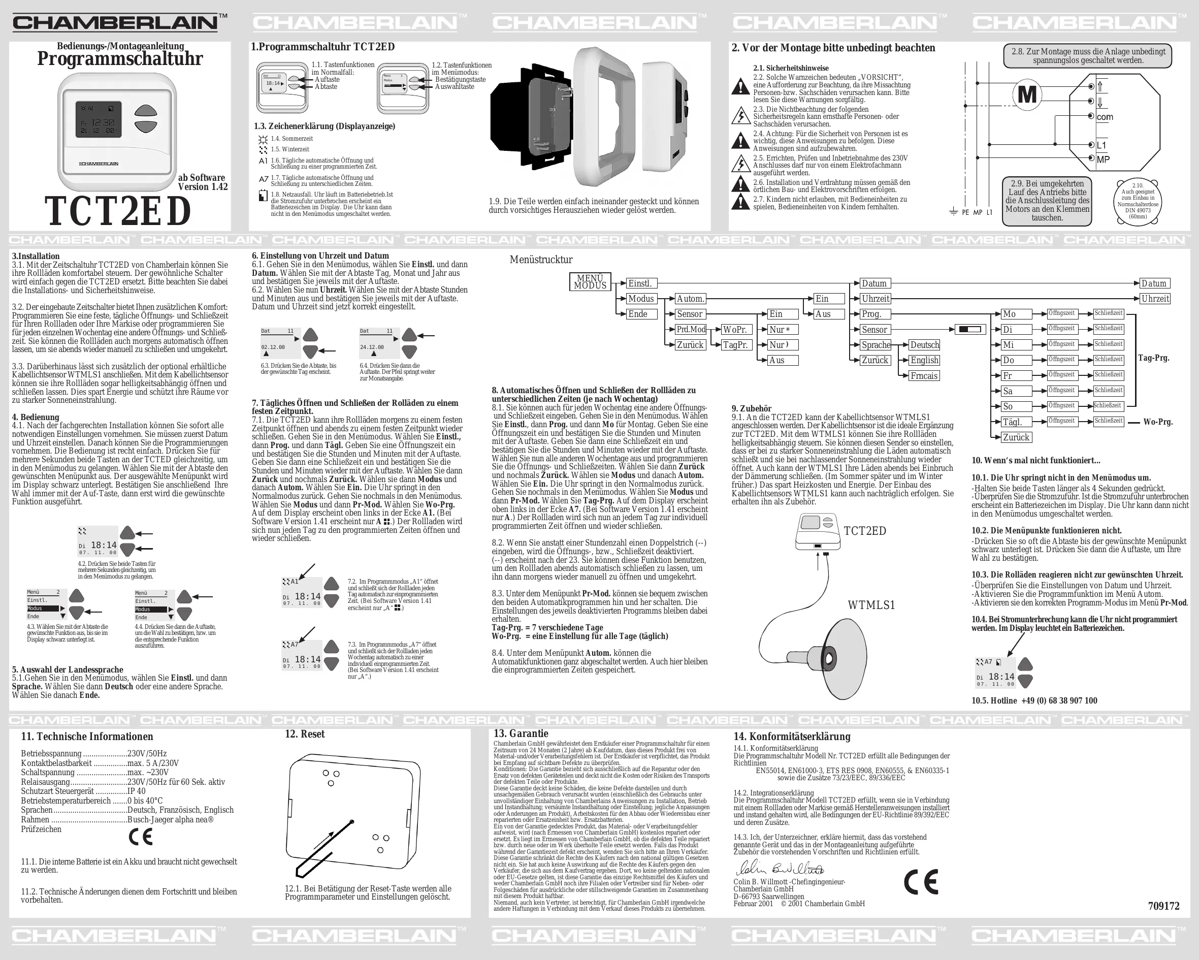 Le horloge programmable, modèle TCT2ED, si installé et maintenu selon toutes les instructions du fabricant, de concert avec un volet qui a, lui aussi, été installé et maintenu selon toutes les instructions du fabricant, satisfait aux clauses de la Directive EU 89/392/EEC et de toutes ses modifactions. 14.3. Je soussigné déclare par la présente que l’equipement spécifié ci-dessus et tout accessoire mentionné dans ce manuel est conforme aux Directives et Normes ci-dessus. Colin B. Willmott -ChefingenieurChamberlain GmbH D-66793 Saarwellingen Février, 2001 © Chamberlain GmbH, 2001