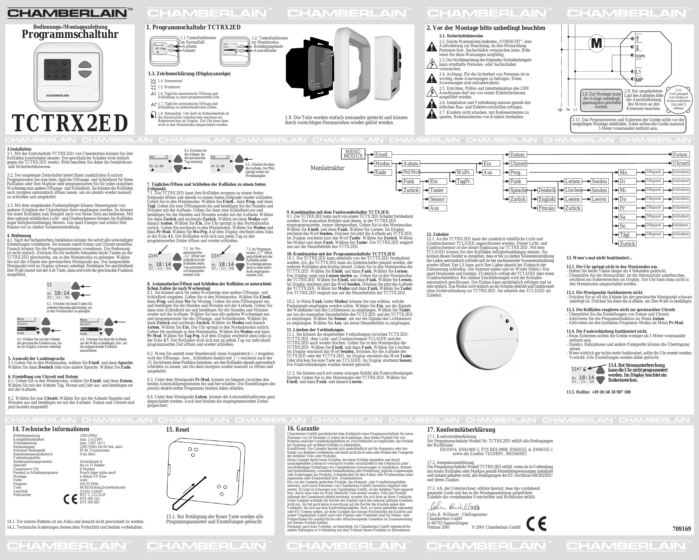 Le horloge programmable, modèle TCTRX2ED, si installé et maintenu selon toutes les instructions du fabricant, de concert avec un volet qui a, lui aussi, été installé et maintenu selon toutes les instructions du fabricant, satisfait aux clauses de la Directive EU 89/392/EEC et de toutes ses modifactions. 17.3. Je soussigné déclare par la présente que l’equipement spécifié ci-dessus et tout accessoire mentionné dans ce manuel est conforme aux Directives et Normes ci-dessus. Colin B. Willmott -ChefingenieurChamberlain GmbH D-66793 Saarwellingen Février, 2001