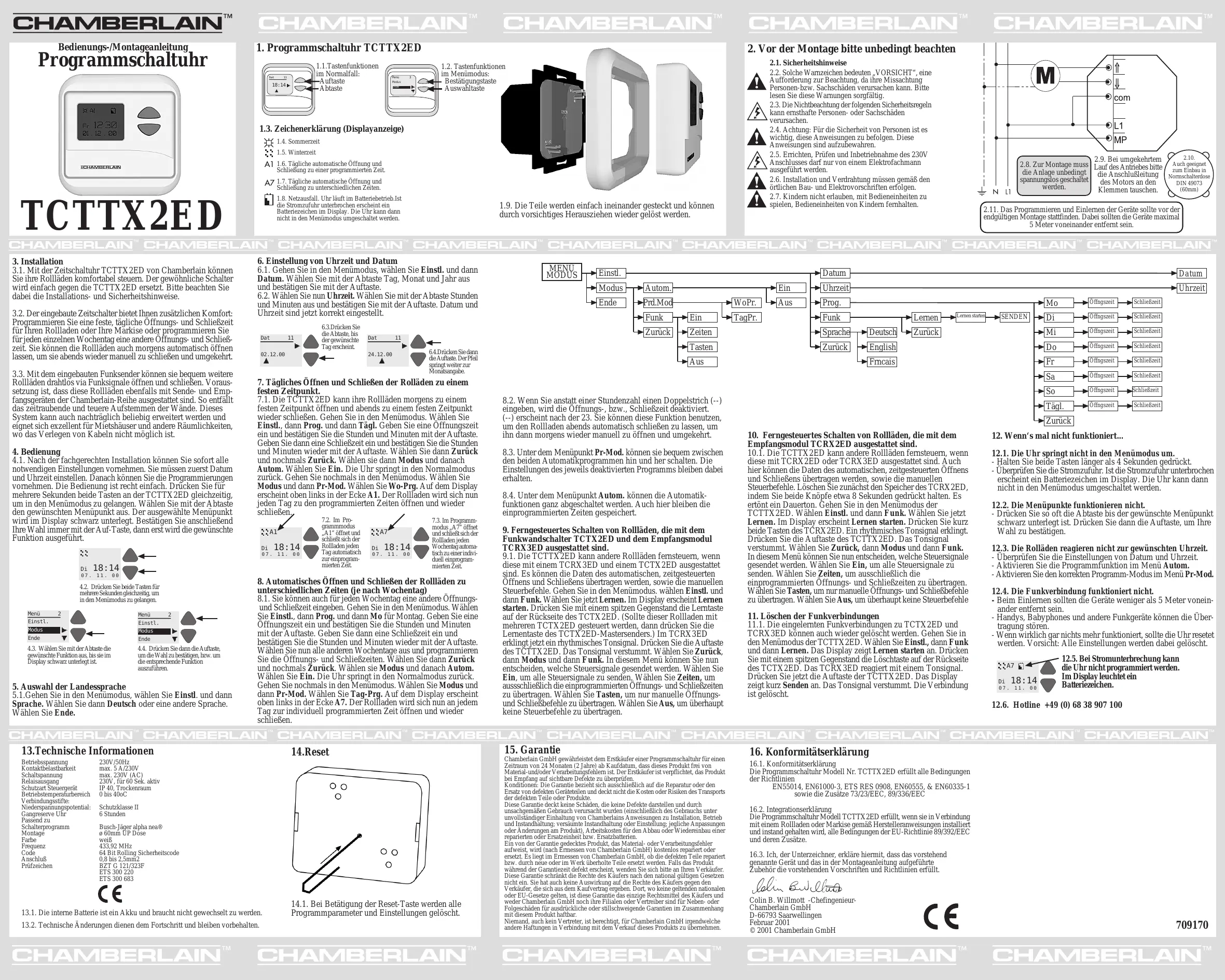 11.1. U kunt de aangeleerde verbindingen tussen de TCTX2ED, TCRX3ED ook weer resetten. Gaat U in de Menumode van de TCTTX2ED. Nu kiest U eerst sonore continu est alors émis. Aller dans le mode Menu du TCTTX2ED. Choisissez ajuster, puis radio. Choisissez ensuite enreg.. A l’écran apparaît alors le mot activez apprdre. Appuyez brièvement sur les deux touches du TCRX2ED. Un signal sonore discontinu est émis. Appuyez sur la touche Haut du TCTTX2ED. Le signal sonore cesse. Choisissez retour, puis mode puis encore radio. Dans ce menu, vous pouvez choisir les signaux de commande à émettre. Choisissez activ pour envoyer tous les signaux de commande. Choisissez temps pour transmettre exclusivement les heures d’ouverture et de fermeture programmées. Choisissez buttons pour transmettre exclusivement les commandes d’ouverture et de fermeture manuelles. Choisissez desact. pour ne transmettre aucun ordre de commande. Fréquence ....433,92 MHz Code ....Code de sécurité de roulement 64 bits Connexion ....0,8 à 2,5 mm2 Marques de conformité ....BZT G 121/323F ETS 300 220 ETS 300 683,CE 13.1. La batterie interne est un accumulateur et n’a pas besoin d’être changée. 13.2. Les modifications techniques suivent l’état de la technique et demeurent sous réserve.