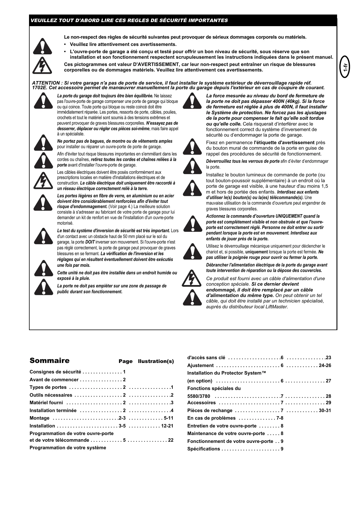 Temps de va-et-vient 96-135mm par seconde LampeAllumée au démarrage de la porte, éteinte 2-1/2 minutes après l’arrêt. Tringlerie de porte Bras de porte ajustable. Tirez la corde de dégagement du chariot. Sécurité PersonnelleArrêt par bouton-poussoir en MONTEE et DESCENTE. Inversion de marche à force automatique en MONTEE et DESCENTE. ElectroniqueRéglage de la force automatique ElectriqueProtection de surcharge de transformateur et câblage de boutonpoussoir basse tension. Extension de l’appareil ...Circuit actionné par écrou freiné. Réglage des fins de course Réglage au tournevis sur le panneau latéral. Circuit de démarrage Circuit à bouton-poussoir basse tension. Dimensions Longueur (hors tout) 3,1m Espace de dégagement nécessaire 30mm Poids en suspension 14,5kg Mémoire à code de clavier 1 REMARQUE SPECIALE : Chamberlain recommande vivement l'installation du système de protection "Protector" sur tous les ouvre-portes de garage. Déclaration de conformité Je soussigné déclare par la présente que l'appareil spécifié ainsi que tous les accessoires satisfont aux directives et normes indiquées. Modèle:5580, 3780 2004/108/EC 2006/95/EC • Le système de verrouillage extérieur ou le Système d’ouverture sans clé (si vous avez installé l’un de ces accessoires). • La télécommande. Appuyez sur le bouton jusqu’à ce que la porte commence à se mouvoir. Ouverture manuelle de la porte : La porte doit être fermée complètement si possible. Des ressorts distendus ou cassés peuvent provoquer la fermeture brutale d’une porte ouverte. La porte peut fonctionner manuellement, lorsqu’on tire la poignée de dégagement manuel vers le bas et l’arrière, vers (l’ouvre-porte). Pour reconnecter la porte, tirez la poignée de dégagement tout droit. Il se réattachera lors de la prochaine montée ou baisse. N’utilisez pas la poignée de dégagement manuel pour ouvrir ou fermer la porte. Lorsque l'ouvre-porte est actionné par la télécommande ou le bouton lumineux de commande de porte : 1. Si elle est ouverte, la porte se fermera. Si elle est fermée, elle s’ouvrira. 2. Si elle est en train de se fermer, la porte s'arrêtera. 3. Si elle est entrain de s’ouvrir, elle s’arrêtera. 4. Si la porte a été arrêtée dans une position partiellement ouverte ou fermée, elle changera de sens de marche. 5. Si elle rencontre un obstacle en se fermant, elle se réouvrira. 6. Si elle rencontre un obstacle lors de l'ouverture, le sens de marche de la porte s'inversera brièvement. 7. Le Protector System™ est détecté automatiquement et un faisceau invisible, lorsqu'il est rompu par un obstacle, provoque l'ouverture d'une porte qui se ferme et empêche une porte ouverte de se fermer. Son action peut être annulée uniquement par le verrou extérieur, le système d'accès sans clé ou le bouton de commande de porte. Laissez le moteur de l’ouvre-porte refroidir pendant 15 minutes après l’avoir fait fonctionner cinq fois de suite. La lumière de l’ouvre-porte s’allumera: 1. lorsqu’on branche l’ouvre-porte pour la première foi. 2. lorsqu’il y a une coupure de courant. 3. quand l’ouvre-porte est débranché. La lumière s’éteint automatiquement au bout de 2 minutes et demi. L’ampoule doit être de 40 W maximum.