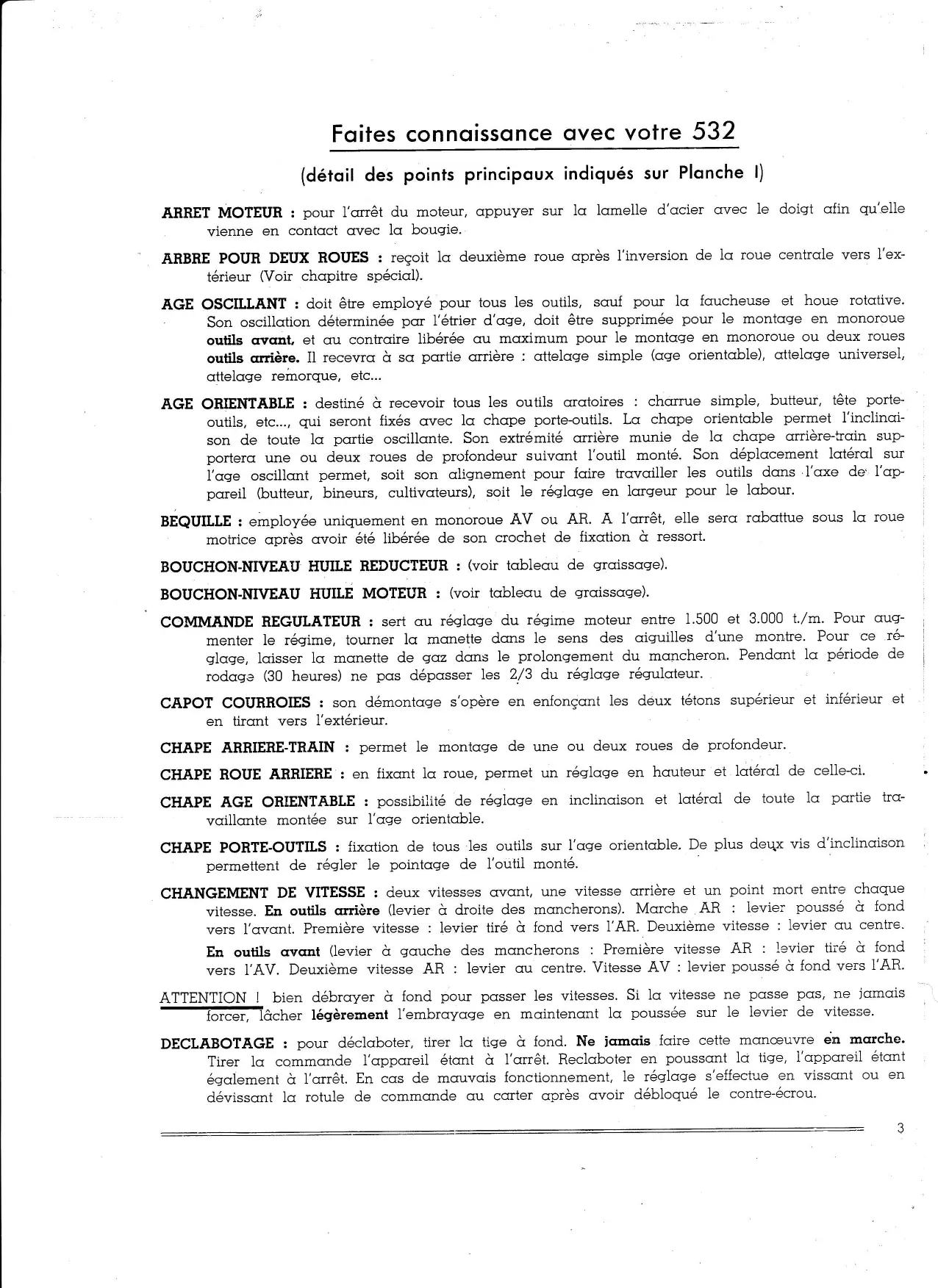 VOTET D'ÀtB : Position I : fermé. Position 2 : ouvert. (Voir mise en morche moteur). Comment entretenir votre 532 Lc durée de votre oppcneil dépend de son entretien. N'hésitez pas à « perdre » guelgues minutes. Vous gqgnerez des heures de ,trcvoil et de sctis- foction. tES IO TIEUBES DE MABCHE : Vériiicotion du {iltre à crir et nettoyqge suivqnt indicqtions portées sur Ie boîtier. - Véri{icotion du nivequ d'huile cqrter moteur et compléter s'il y cr lieu (pour ce contrôle, prendre soin de mettre le moteur dons une position bien verticole). Groissqge à lcr burette des commcrndes et tringleries, cinsi que roues qrrières, pivot moteur, -glissière inIérieure, moteur, étrier d'crge, poignée débrcryoge, etc... TOUTES tES 30 PBEMIEBES HEURES DE MABCHE : Vldonser tolqlement le moteur et le ccrter réducteur. Re{crire les pleins suivqnt instructions -du tobleou de grqissqge. II est conseillé de foire toutes les vidonqes & choud qprès quelques heures de mqrche. .APBES TOUTES LES 70 HEUBES DE MABCHE (oprès période de rodoqe) -sqge.Vidcrnser totcrlement 1e moteur