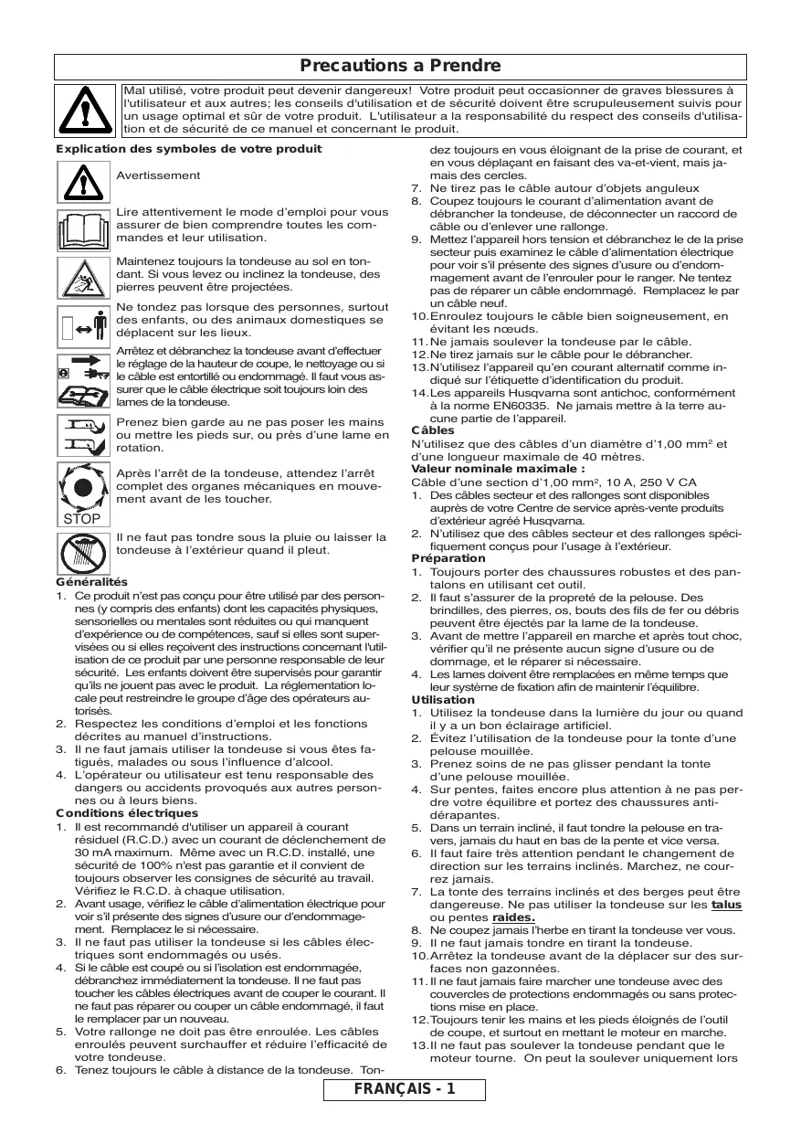 Precautions a Prendre Mal utilisé, votre produit peut devenir dangereux! Votre produit peut occasionner de graves blessures à l'utilisateur et aux autres; les conseils d'utilisation et de sécurité doivent être scrupuleusement suivis pour un usage optimal et sûr de votre produit. L'utilisateur a la responsabilité du respect des conseils d'utilisation et de sécurité de ce manuel et concernant le produit. Explication des symboles de votre produit Avertissement Lire attentivement le mode dʼemploi pour vous assurer de bien comprendre toutes les commandes et leur utilisation. Maintenez toujours la tondeuse au sol en tondant. Si vous levez ou inclinez la tondeuse, des pierres peuvent être projectées. Ne tondez pas lorsque des personnes, surtout des enfants, ou des animaux domestiques se déplacent sur les lieux. Arrêtez et débranchez la tondeuse avant dʼeffectuer le réglage de la hauteur de coupe, le nettoyage ou si le câble est entortillé ou endommagé. Il faut vous assurer que le câble électrique soit toujours loin des lames de la tondeuse. Prenez bien garde au ne pas poser les mains ou mettre les pieds sur, ou près dʼune lame en rotation. Après lʼarrêt de la tondeuse, attendez lʼarrêt complet des organes mécaniques en mouvement avant de les toucher. STOP Il ne faut pas tondre sous la pluie ou laisser la tondeuse à lʼextérieur quand il pleut. Généralités