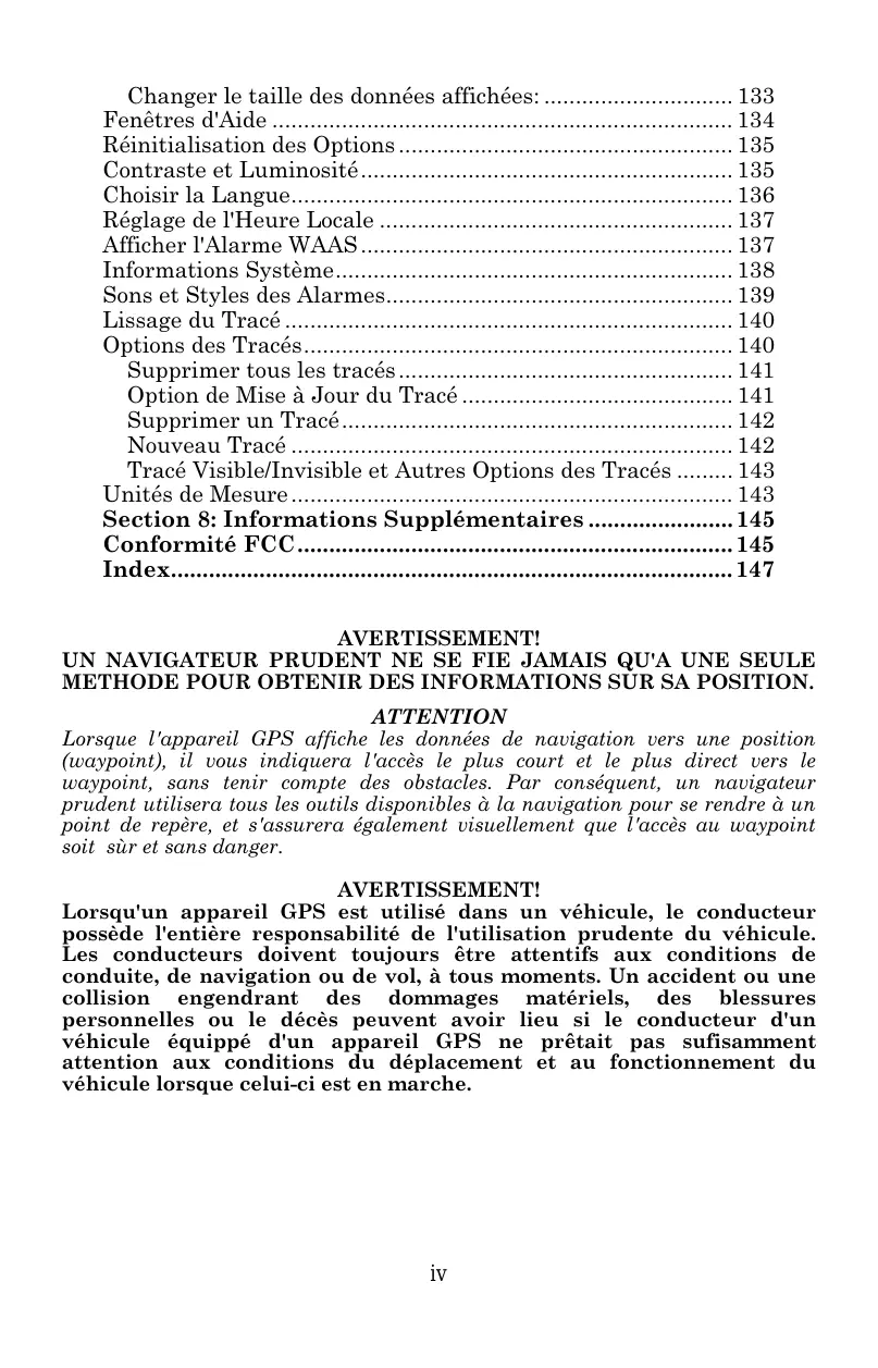 Conformité FCC..................................................................... 145 Index......................................................................................... 147 AVERTISSEMENT! UN NAVIGATEUR PRUDENT NE SE FIE JAMAIS QU'A UNE SEULE METHODE POUR OBTENIR DES INFORMATIONS SUR SA POSITION. ATTENTION Lorsque l'appareil GPS affiche les données de navigation vers une position (waypoint), il vous indiquera l'accès le plus court et le plus direct vers le waypoint, sans tenir compte des obstacles. Par conséquent, un navigateur prudent utilisera tous les outils disponibles à la navigation pour se rendre à un point de repère, et s'assurera également visuellement que l'accès au waypoint soit sùr et sans danger. AVERTISSEMENT! Lorsqu'un appareil GPS est utilisé dans un véhicule, le conducteur possède l'entière responsabilité de l'utilisation prudente du véhicule. Les conducteurs doivent toujours être attentifs aux conditions de conduite, de navigation ou de vol, à tous moments. Un accident ou une collision engendrant des dommages matériels, des blessures personnelles ou le décès peuvent avoir lieu si le conducteur d'un véhicule équippé d'un appareil GPS ne prêtait pas sufisamment attention aux conditions du déplacement et au fonctionnement du véhicule lorsque celui-ci est en marche.