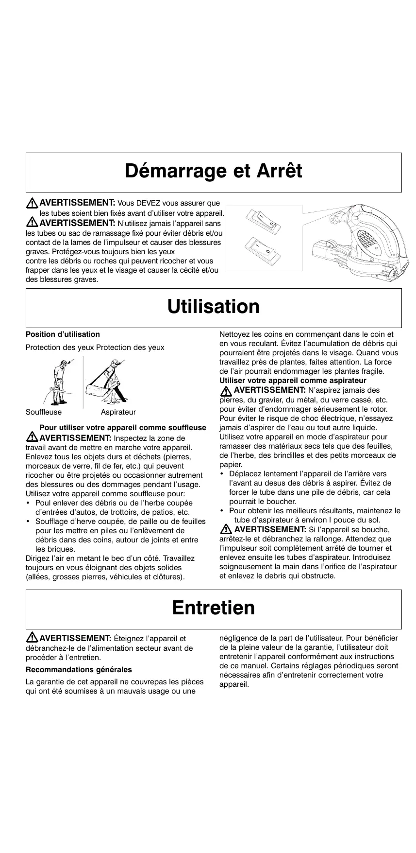 les tubes ou sac de ramassage fixé pour éviter débris et/ou contact de la lames de l’impulseur et causer des blessures graves. Protégez-vous toujours bien les yeux contre les débris ou roches qui peuvent ricocher et vous frapper dans les yeux et le visage et causer la cécité et/ou des blessures graves. Utilisation Position d’utilisation Protection des yeux Protection des yeux Souffleuse Aspirateur Pour utiliser votre appareil comme souffleuse