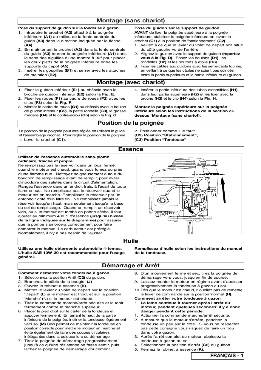 (C2) Position “Stationnement”, (C3) Position “Tondeuse” [ Essence ] Utilisez de l'essence automobile sans-plomb ordinaire, fraîche et propre. Ne remplissez pas le réservoir dans un local fermé, quand le moteur est chaud, quand vous fumez ou près d'une flamme nue. Nettoyez soigneusement autour du bouchon de remplissage avant de remplir, pour éviter d'introduire des saletés dans le circuit d'alimentation. Rangez l'essence dans un endroit frais, à l'écart de toute flamme nue. Ne remplissez pas le réservoir quand le moteur est en marche. Remplissez le réservoir par un entonnoir doté d'un filtre fin. Ne remplissez jamais le réservoir jusqu'en haut, mais seulement jusqu'à la base du col de remplissage. Quand on remplit un réservoir vide, ou si le moteur est tombé en panne sèche, il faut ajouter au minimum 400 cl d'essence (jusqu'au niveau de la ligne indiquée sur le diagramme) pour assurer que la pompe s'amorcera correctement pour faire démarrer le moteur. Le carburateur est préréglé. Normalement, i n'y a pas besoin de l'ajuster. [ Huile ] Utilisez une huile détergente automobile 4-temps. L'huile SAE 10W-30 est recommandée pour l'usage général. Remplissez d'huile selon les instructions du manuel de la tondeuse. [ Démarrage et Arrêt ] Comment démarrer votre tondeuse à gazon.