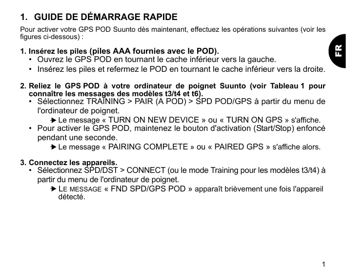 Le GPS POD n'a besoin d'être relié à votre ordinateur de poignet Suunto qu'une seule fois. Une fois la liaison effectuée, votre ordinateur de poignet affichera le mode SPD/DST qui permet d'afficher les informations sur la distance et la vitesse. Les instructions sur la liaison sont indiquées dans le Guide de démarrage ci-dessus. Si la liaison échoue, l'ordinateur de poignet revient au menu de liaison (après une tentative de 15-30 secondes). Le message « NO DEVICES FOUND » s'affiche alors brièvement. Assurez-vous qu'il n'y ait ni ceinture émetteur ni POD actifs à proximité.