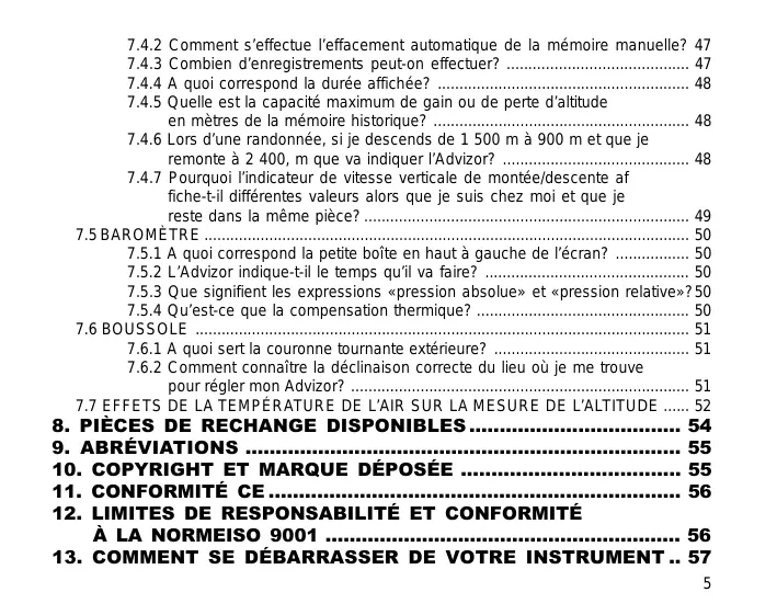 Comment s’effectue l’effacement automatique de la mémoire manuelle? 47 Combien d’enregistrements peut-on effectuer? .......................................... 47 A quoi correspond la durée affichée? .......................................................... 48 Quelle est la capacité maximum de gain ou de perte d’altitude en mètres de la mémoire historique? ........................................................... 48