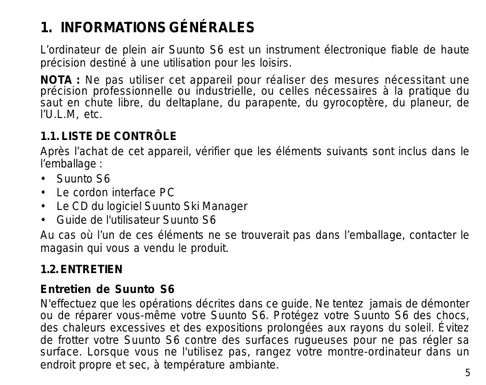L’ordinateur de plein air Suunto S6 est un instrument électronique fiable de haute précision destiné à une utilisation pour les loisirs. NOTA : Ne pas utiliser cet appareil pour réaliser des mesures nécessitant une précision professionnelle ou industrielle, ou celles nécessaires à la pratique du saut en chute libre, du deltaplane, du parapente, du gyrocoptère, du planeur, de l’U.L.M, etc.