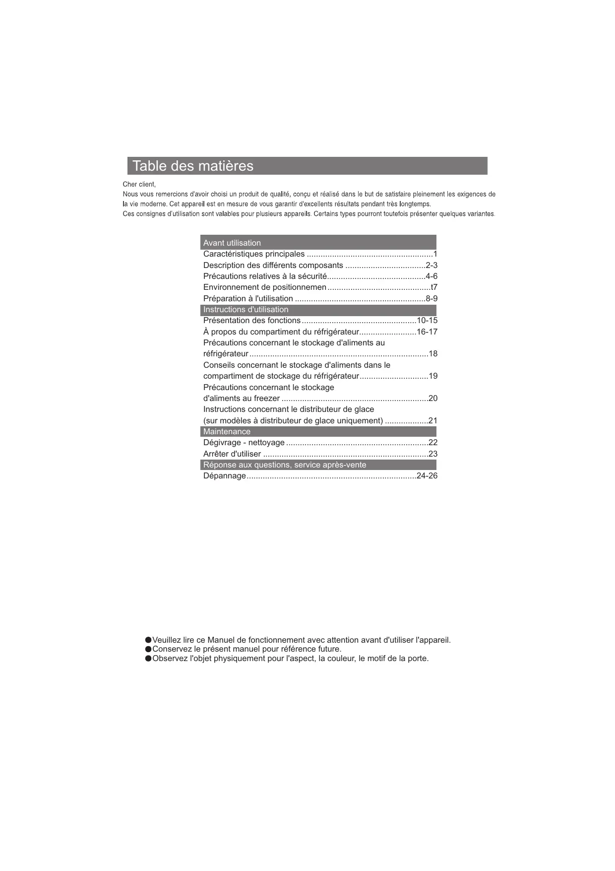 - Table des matières Avant utilisation Caractéristiques principales p. 1