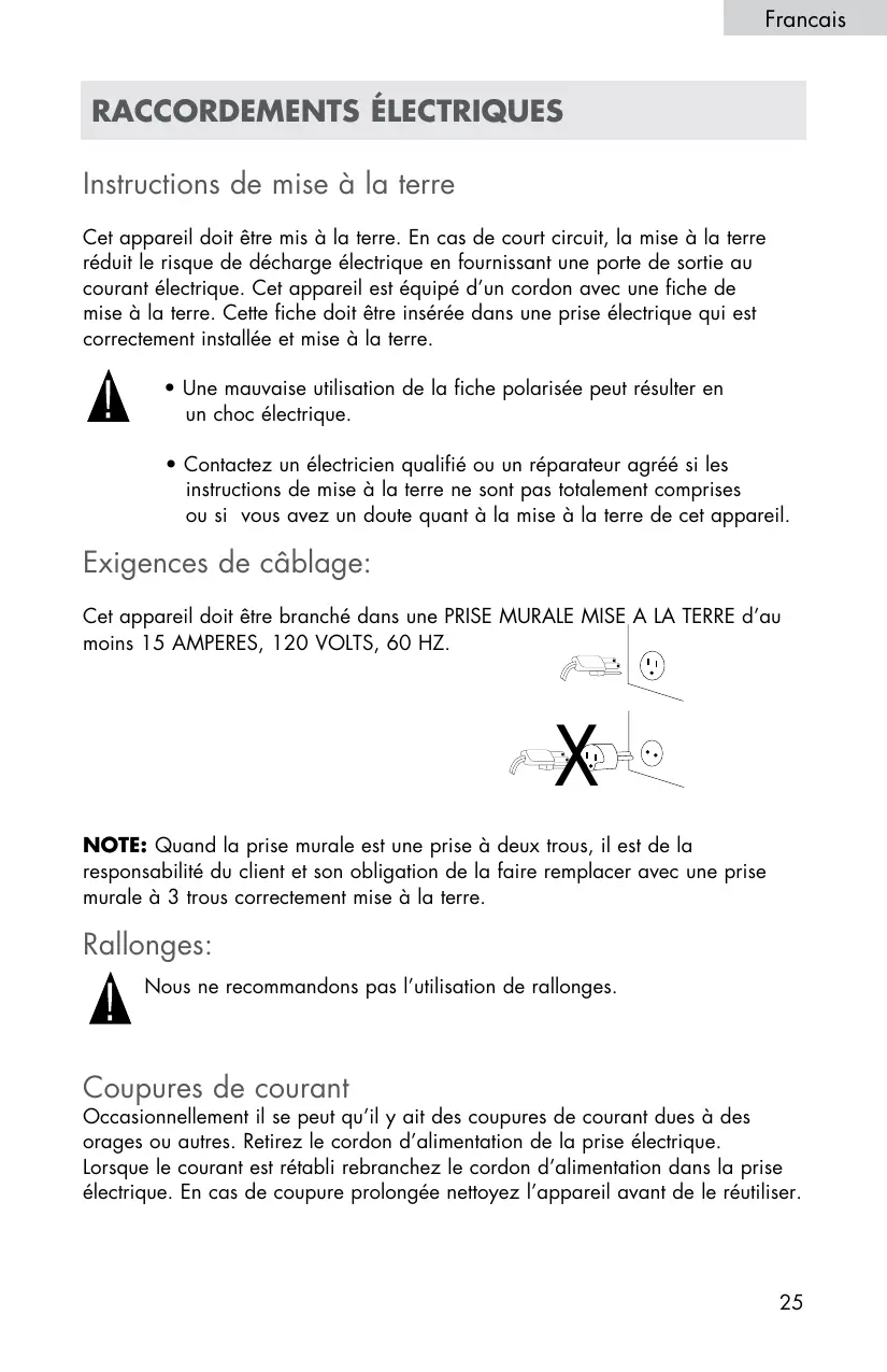 Note: Quand la prise murale est une prise à deux trous, il est de la responsabilité du client et son obligation de la faire remplacer avec une prise murale à 3 trous correctement mise à la terre. Rallonges: Nous ne recommandons pas l’utilisation de rallonges. Coupures de courant Occasionnellement il se peut qu’il y ait des coupures de courant dues à des orages ou autres. Retirez le cordon d’alimentation de la prise électrique. Lorsque le courant est rétabli rebranchez le cordon d’alimentation dans la prise électrique. En cas de coupure prolongée nettoyez l’appareil avant de le réutiliser.
