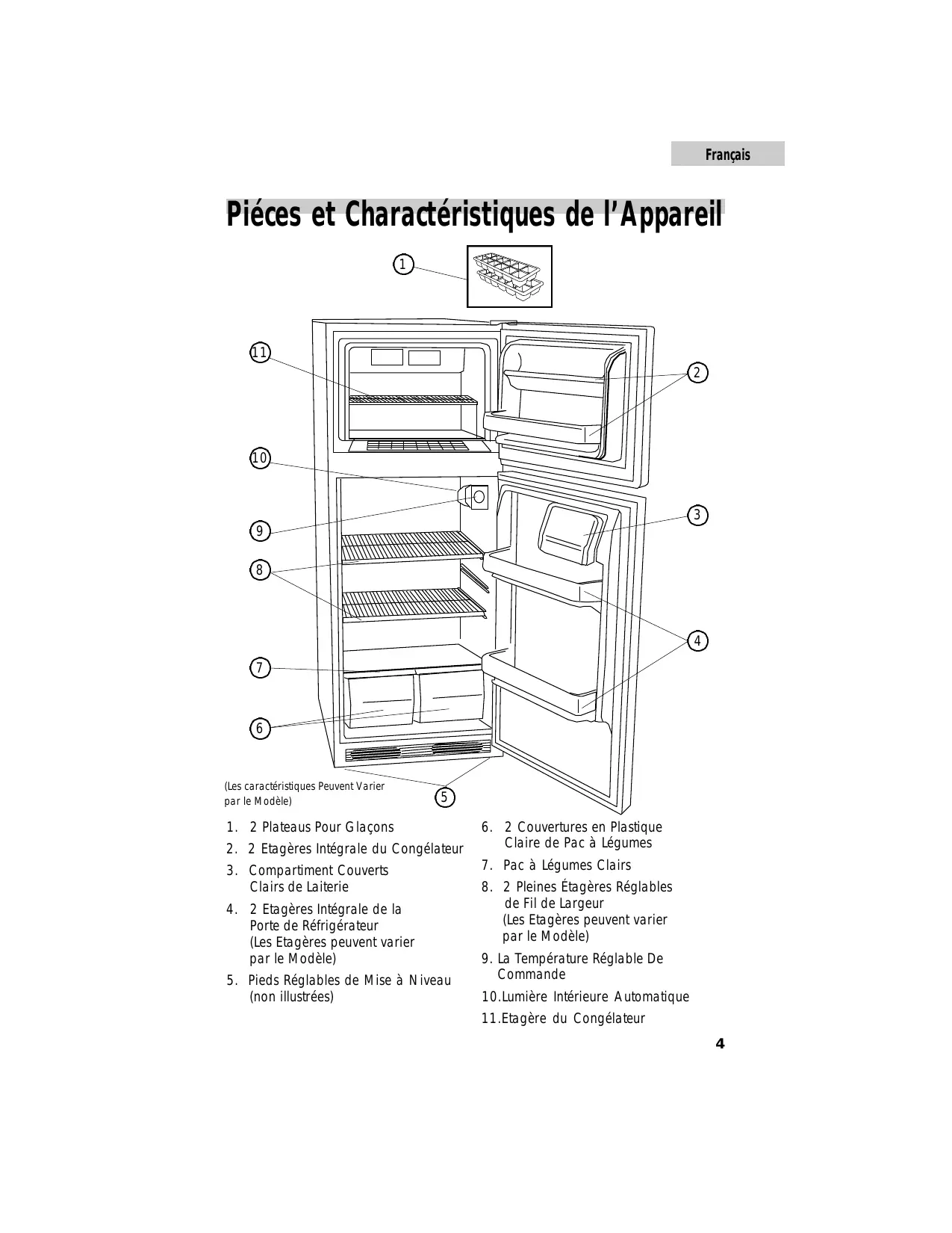 Français Caractéristiques et Utilisation du Réfrigérateur Caractéristiques Générales Cadran de température réglable: Le réfrigérateur maintient automatiquement le niveau de température programmé. Le cadran de contrôle de la température comporte 7 positions plus la position d’arrêt. La position ‘1’ est la plus chaude. La position ‘7’ est la plus froide. Lorsque l’on tourne le cadran sur la position ‘OFF’(arrêt), le réfrigérateur et le congélateur ne refroidissent plus. Au départ, mettre le cadran sur la position ‘4’puis attendre 24 heures avant de régler la température sur la position de votre choix. (Remarque: Si le réfrigérateur a été placé à l’horizontale pendant une période de temps quelconque, attendre 24 heures avant de le brancher). Lumière Intérieure du Compartiment Réfrigérant: Le réfrigérateur est équipé d'une lumière intérieure automatique située au niveau des aliments frais, de manière à pouvoir facilement repérer le contenu du réfrigérateur. Etagères Intérieures du Réfrigérateur (Les Etagères peuvent varier par le Modèle) Les étagères du réfrigérateur ont été conçues pour vous faciliter la vie. Elles sont réglables afin de s’adapter à vos besoins Les possibilités ne sont limitées que par le type de modèle en votre possession et l’étendue de votre imagination. Pour retirer ou régler une étagère de‘largeur intégrale’ coulissante: (Voir fig. # 6)