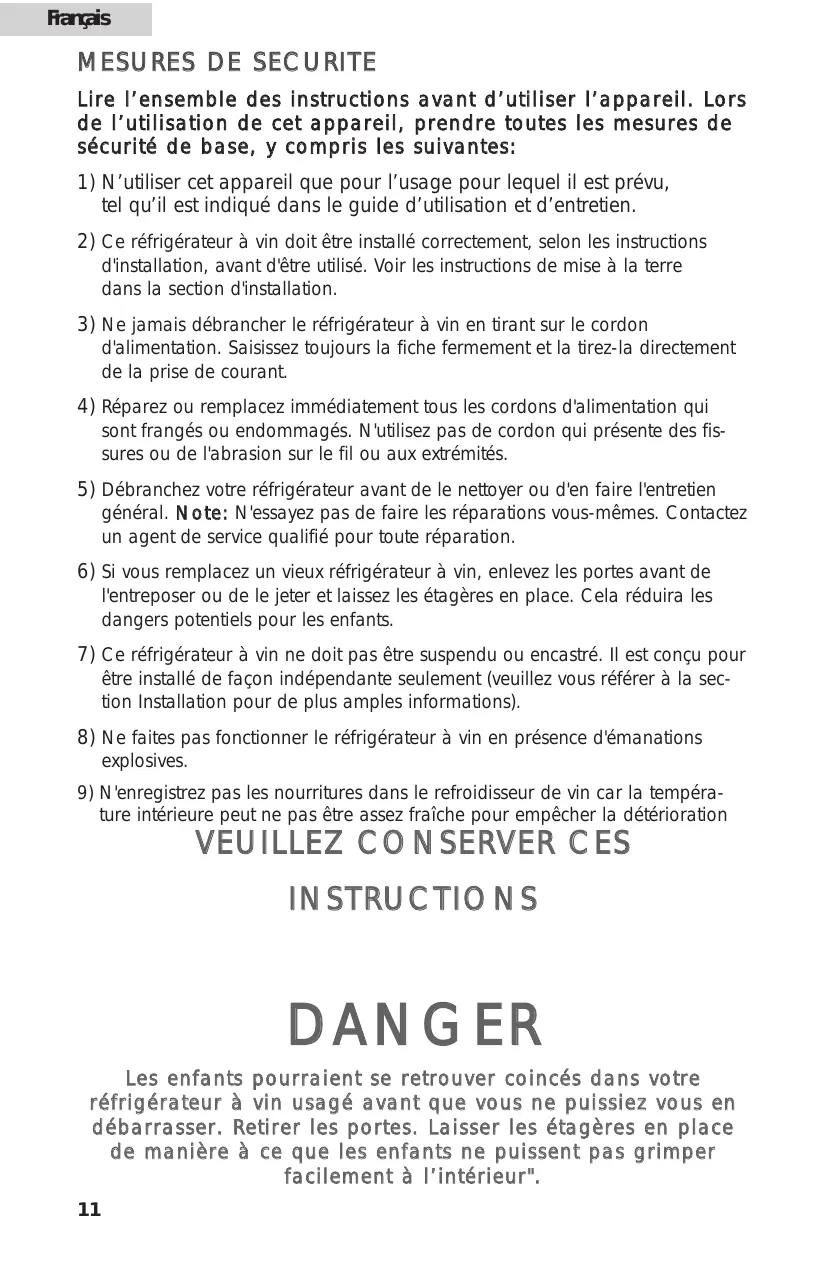 explosives. 9) N'enregistrez pas les nourritures dans le refroidisseur de vin car la température intérieure peut ne pas être assez fraîche pour empêcher la détérioration DANGER Les enfants pourraient se retrouver coincés dans votre réfrigérateur à vin usagé avant que vous ne puissiez vous en débarrasser. Retirer les portes. Laisser les étagères en place de manière à ce que les enfants ne puissent pas grimper facilement à l’intérieur".