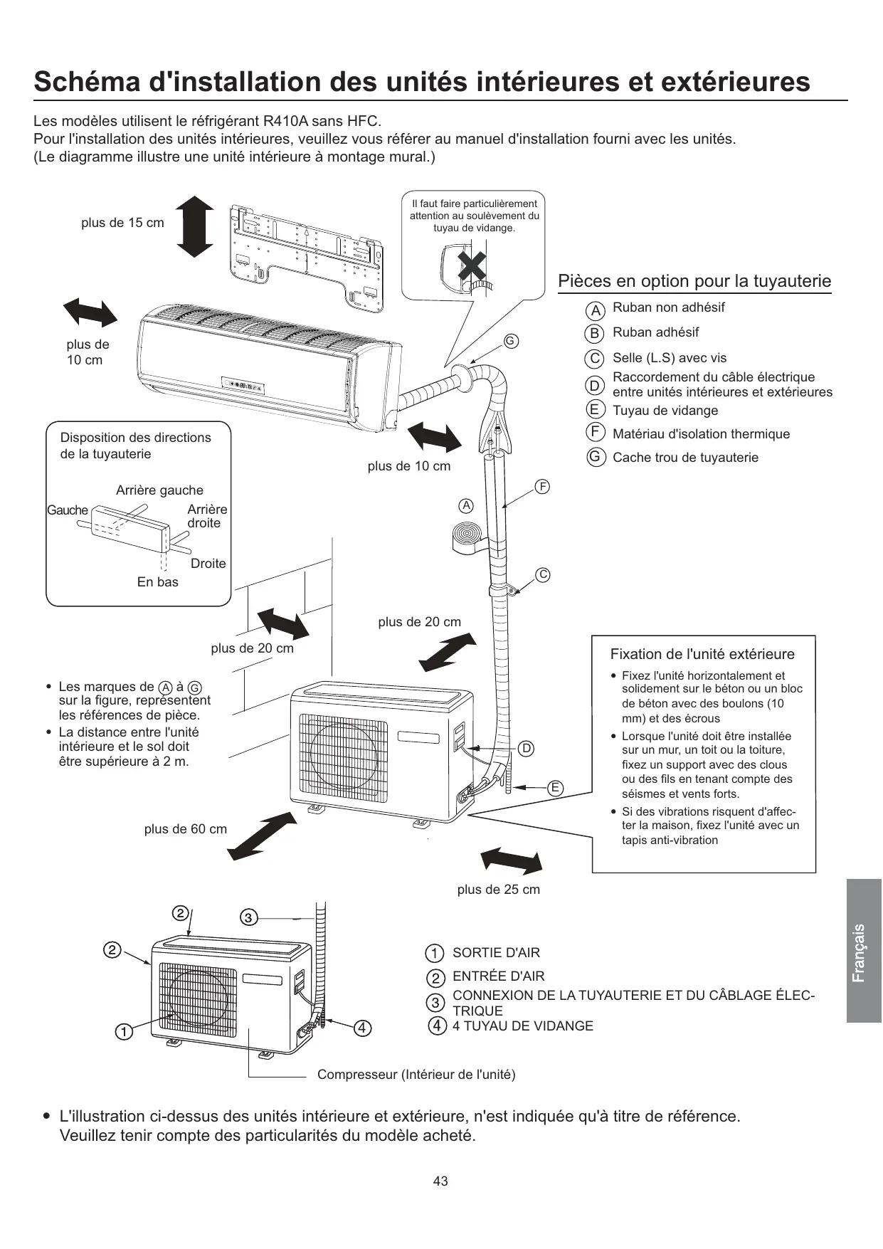 L'illustration ci-dessus des unités intérieure et extérieure, n'est indiquée qu'à titre de référence. Veuillez tenir compte des particularités du modèle acheté.