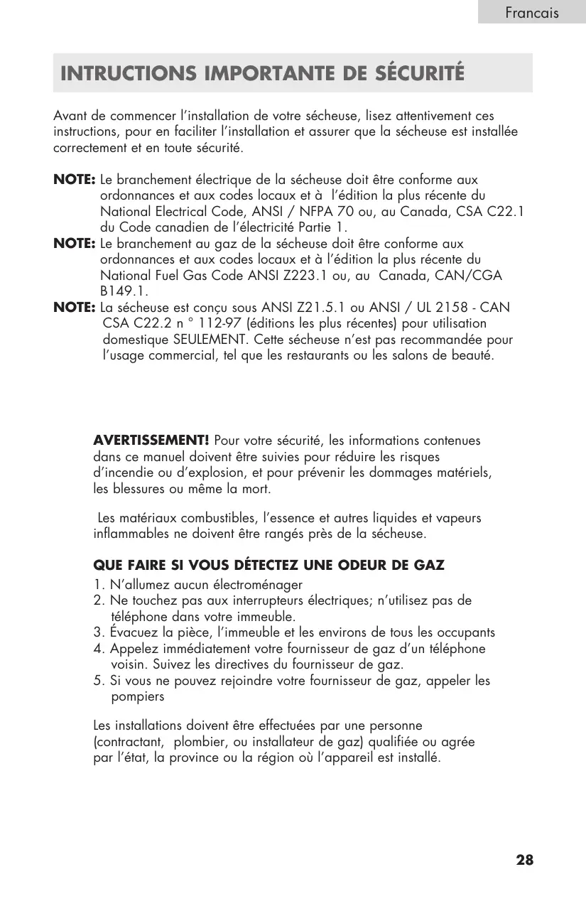 Avant de commencer l’installation de votre sécheuse, lisez attentivement ces instructions, pour en faciliter l’installation et assurer que la sécheuse est installée correctement et en toute sécurité. NOTE: L e branchement électrique de la sécheuse doit être conforme aux ordonnances et aux codes locaux et à l’édition la plus récente du National Electrical Code, ANSI / NFPA 70 ou, au Canada, CSA C22.1 du Code canadien de l’électricité Partie 1. NOTE: Le branchement au gaz de la sécheuse doit être conforme aux ordonnances et aux codes locaux et à l’édition la plus récente du National Fuel Gas Code ANSI Z223.1 ou, au Canada, CAN/CGA B149.1. NOTE: La sécheuse est conçu sous ANSI Z21.5.1 ou ANSI / UL 2158 - CAN CSA C22.2 n ° 112-97 (éditions les plus récentes) pour utilisation domestique SEULEMENT. Cette sécheuse n’est pas recommandée pour l’usage commercial, tel que les restaurants ou les salons de beauté. AVERTISSEMENT! Pour votre sécurité, les informations contenues dans ce manuel doivent être suivies pour réduire les risques d’incendie ou d’explosion, et pour prévenir les dommages matériels, les blessures ou même la mort. Les matériaux combustibles, l’essence et autres liquides et vapeurs inflammables ne doivent être rangés près de la sécheuse. QUE FAIRE SI VOUS DÉTECTEZ UNE ODEUR DE GAZ